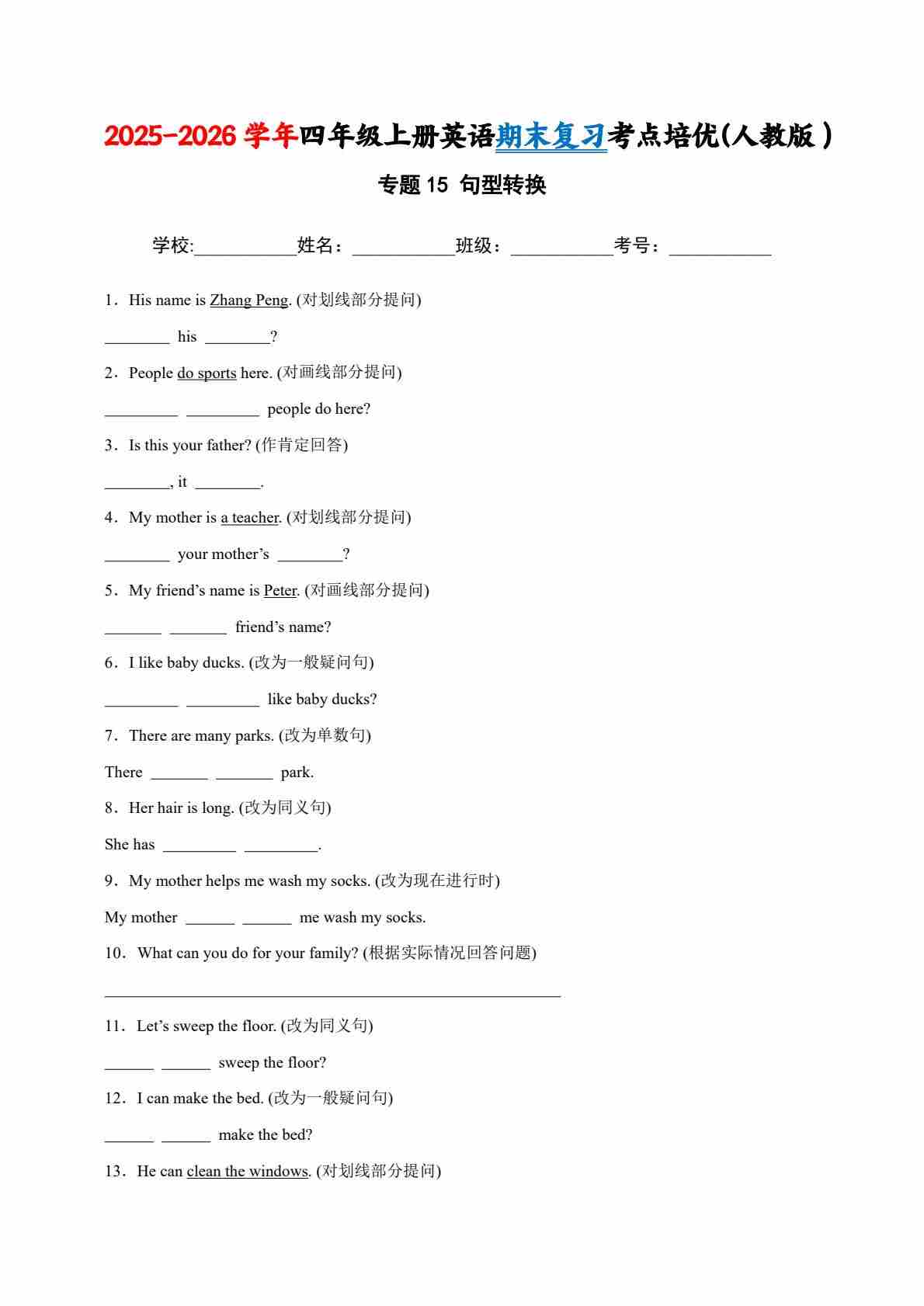 【期末考点培优】专题15 句型转换-2025-2026学年四年级英语上册期末复习考点培优人教版(PEP)(含答案解析)
