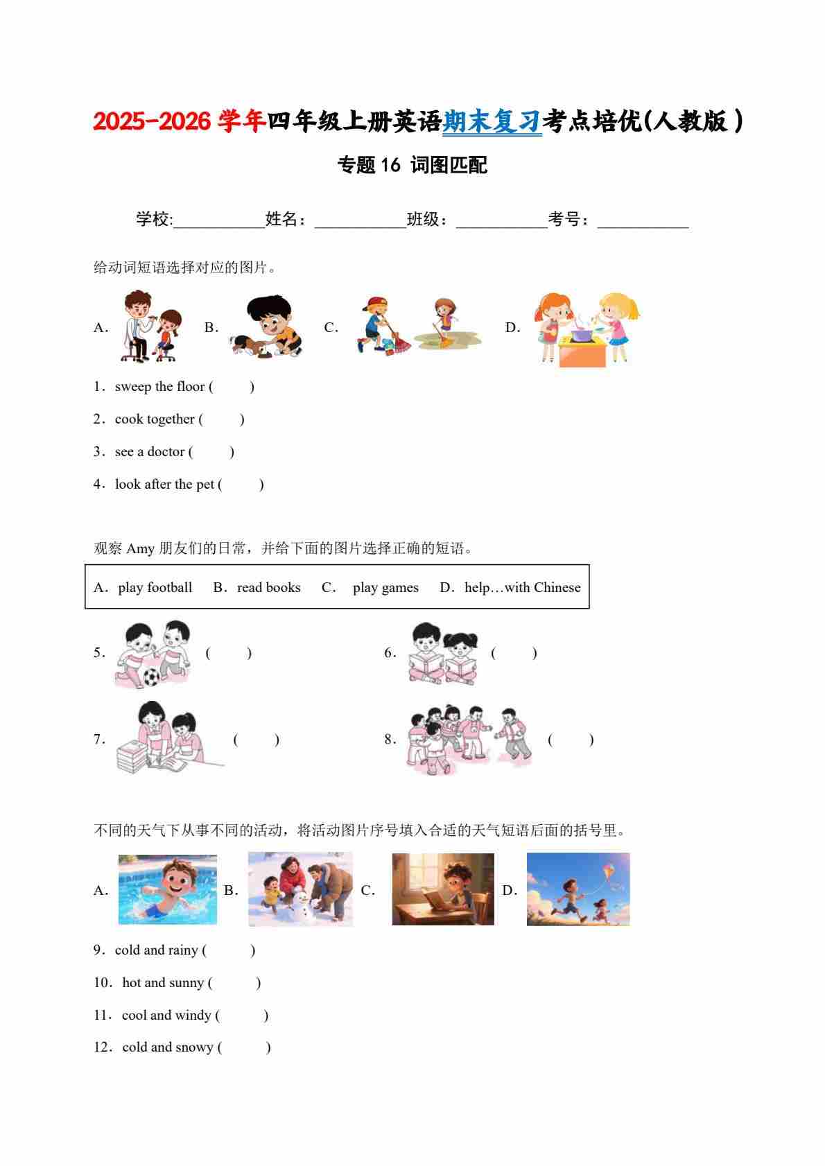 【期末考点培优】专题16 词图匹配-2025-2026学年四年级英语上册期末复习考点培优人教版(PEP)(含答案解析)