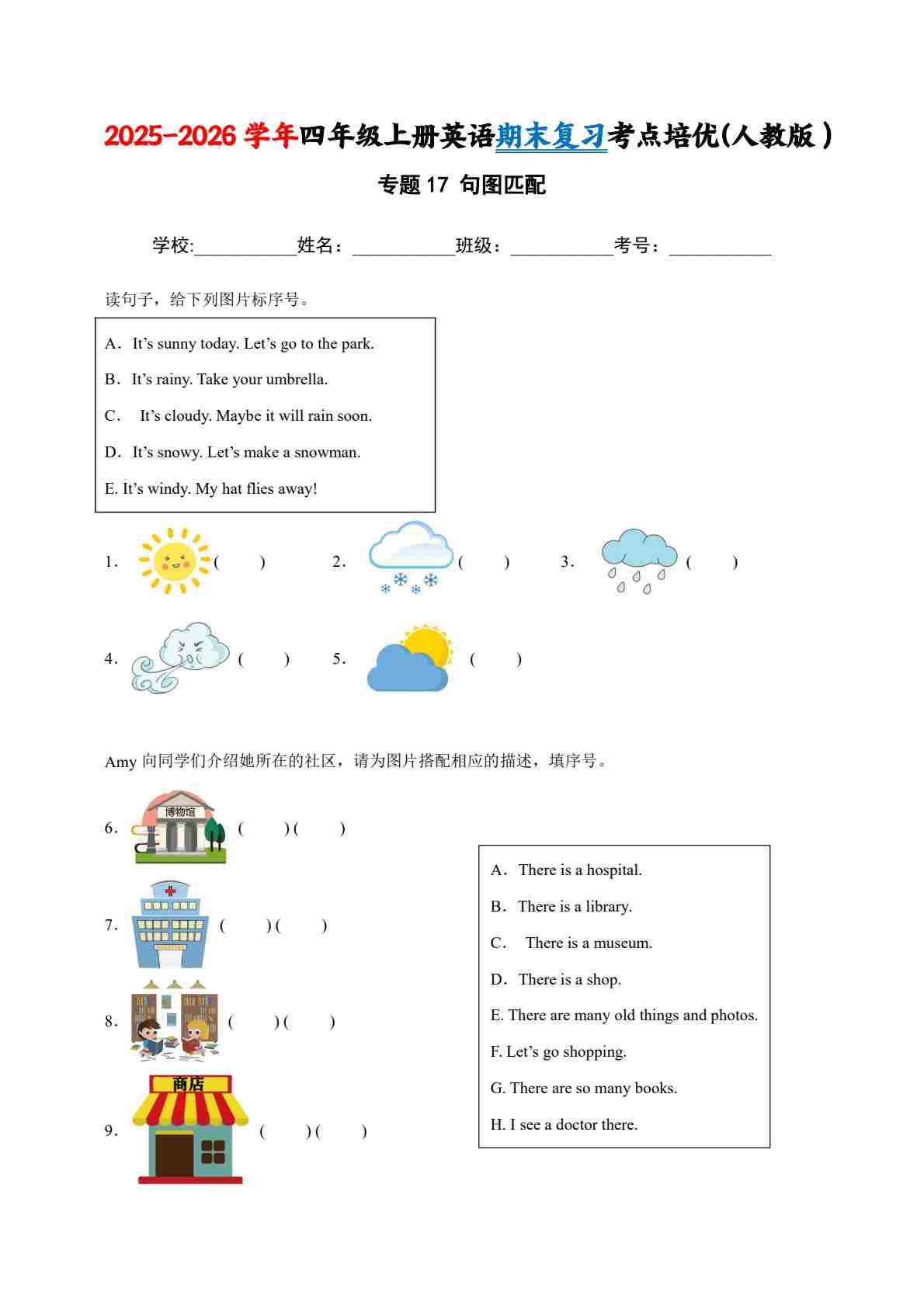 【期末考点培优】专题17 句图匹配-2025-2026学年四年级英语上册期末复习考点培优人教版(PEP)(含答案解析)