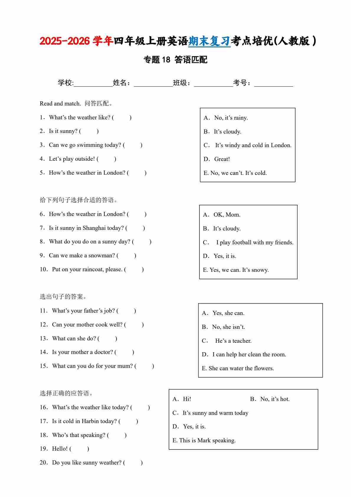 【期末考点培优】专题18 答语匹配-2025-2026学年四年级英语上册期末复习考点培优人教版(PEP)(含答案解析)