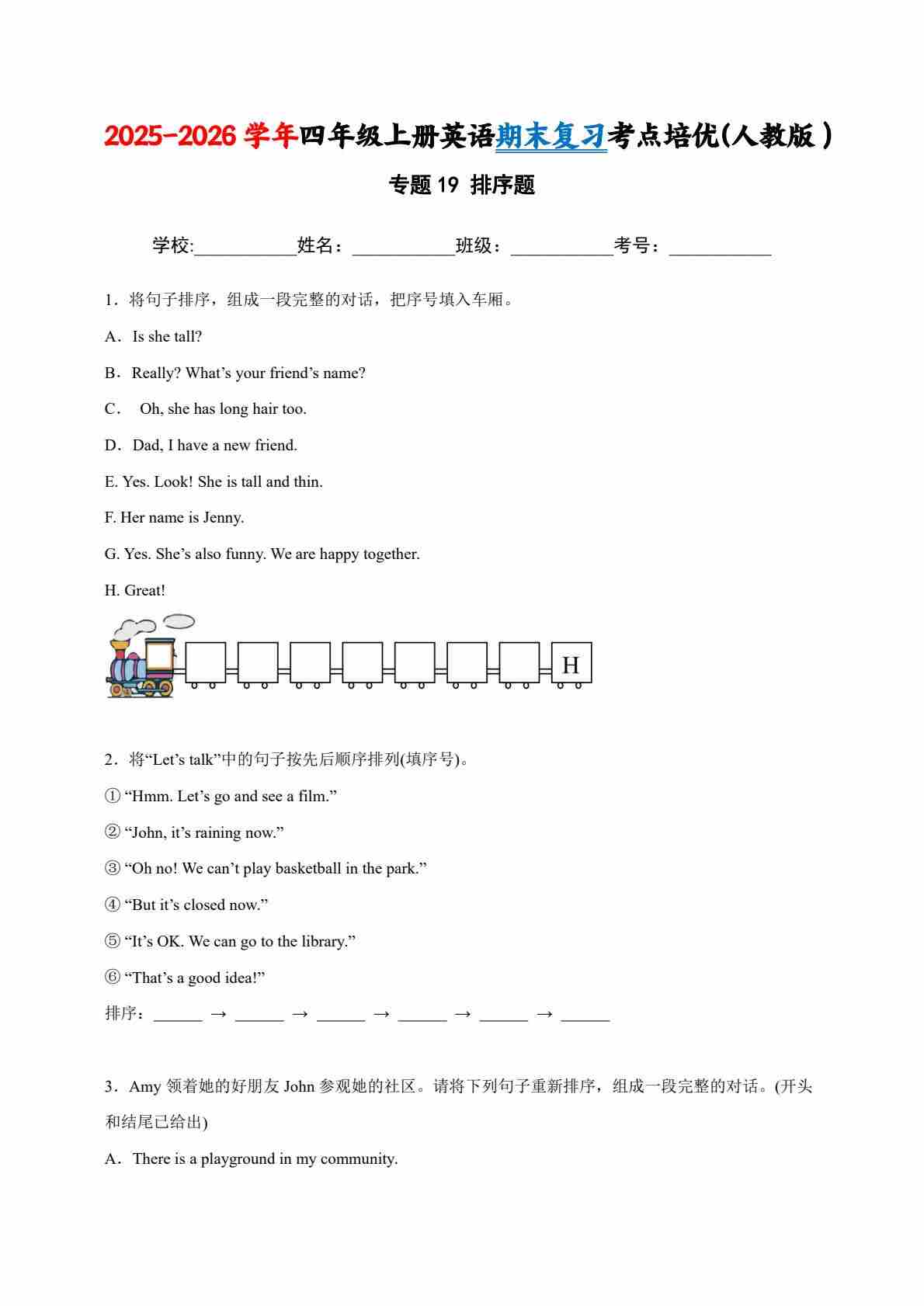 【期末考点培优】专题19 排序题-2025-2026学年四年级英语上册期末复习考点培优人教版(PEP)(含答案解析)