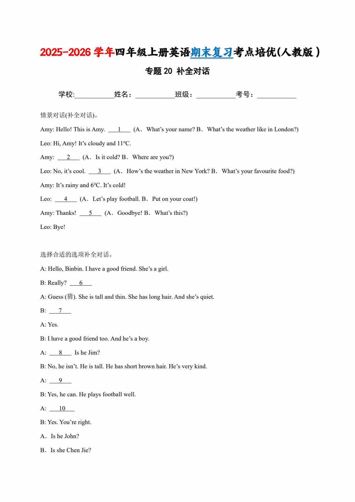 【期末考点培优】专题20 补全对话-2025-2026学年四年级英语上册期末复习考点培优人教版(PEP)(含答案解析)