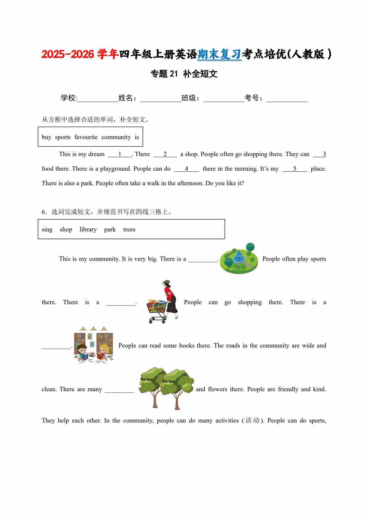 【期末考点培优】专题21 补全短文-2025-2026学年四年级英语上册期末复习考点培优人教版(PEP)(含答案解析)