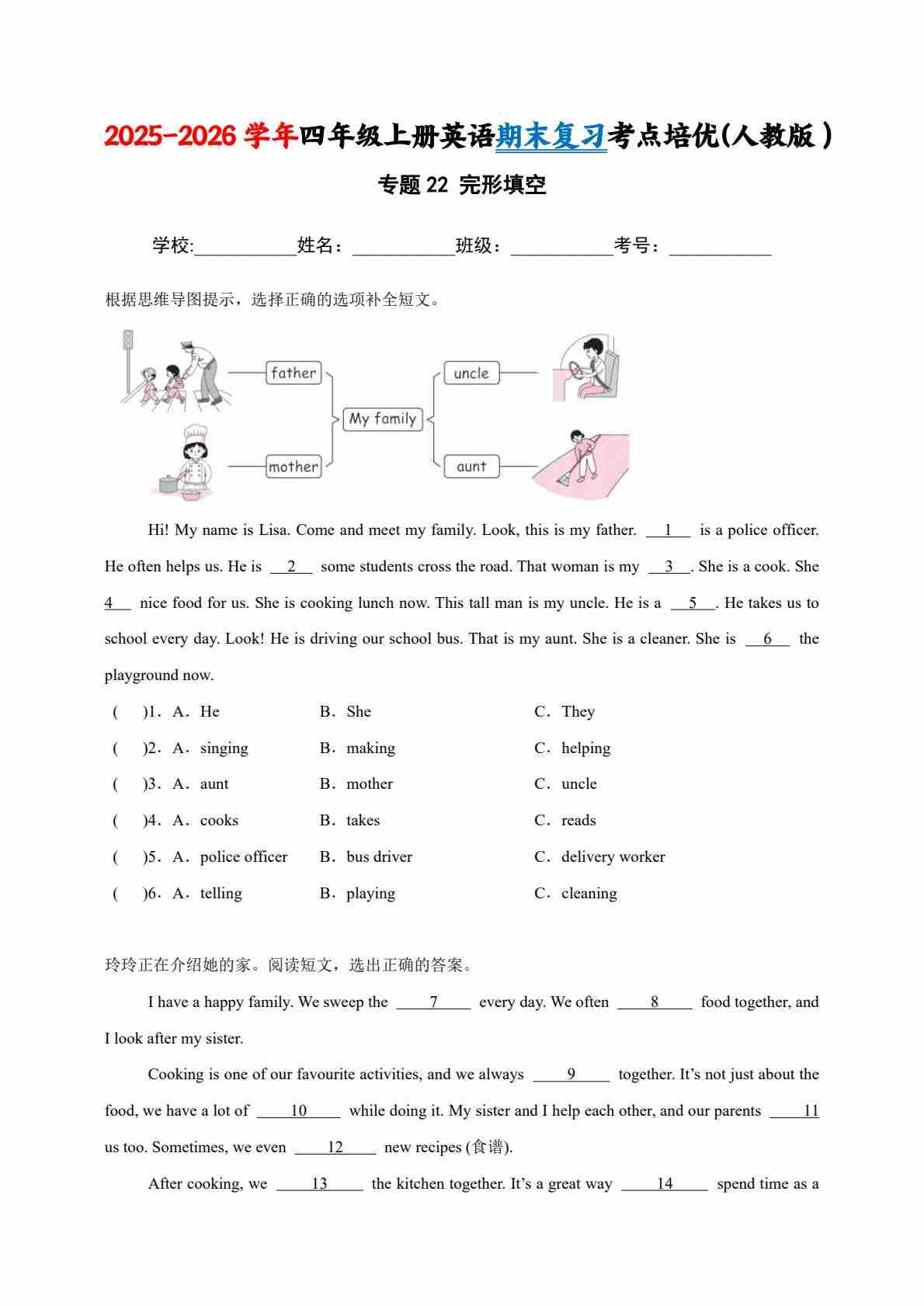 【期末考点培优】专题22 完形填空-2025-2026学年四年级英语上册期末复习考点培优人教版(PEP)(含答案解析)