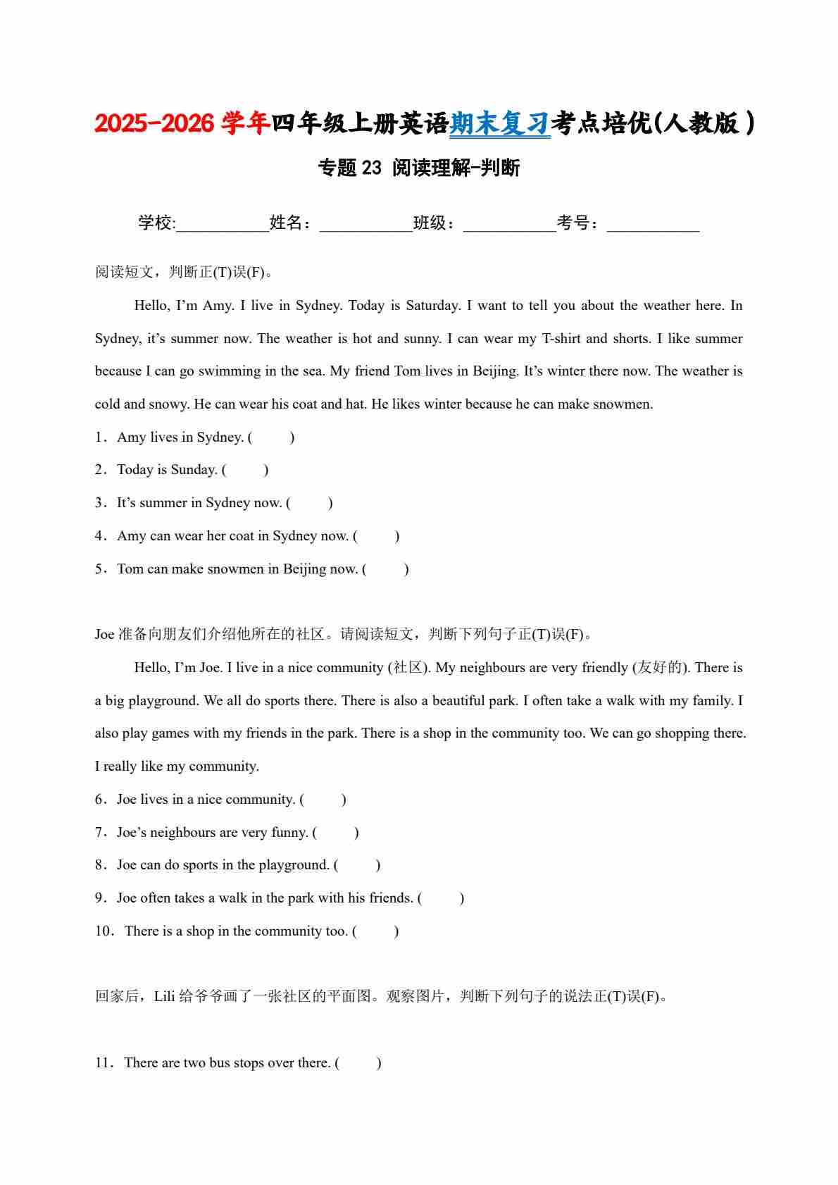 【期末考点培优】专题23 阅读理解-判断-2025-2026学年四年级英语上册期末复习考点培优人教版(PEP)(含答案解析)