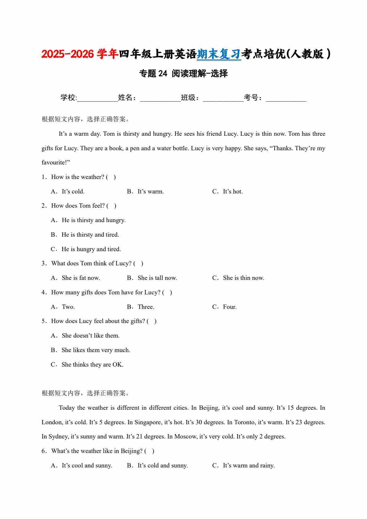 【期末考点培优】专题24 阅读理解-选择-2025-2026学年四年级英语上册期末复习考点培优人教版(PEP)(含答案解析)