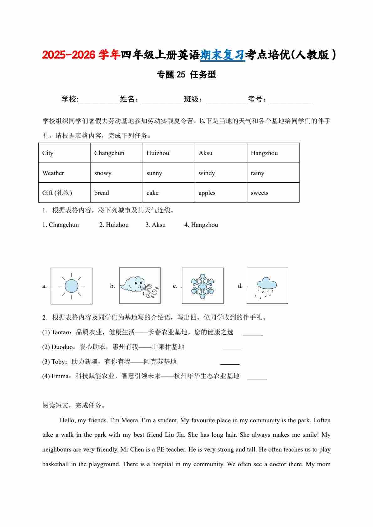 【期末考点培优】专题25 阅读理解-任务型-2025-2026学年四年级英语上册期末复习考点培优人教版(PEP)(含答案解析)
