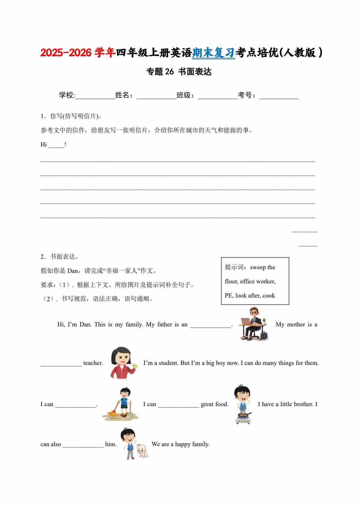【期末考点培优】专题26 书面表达-2025-2026学年四年级英语上册期末复习考点培优人教版(PEP)(含答案解析)
