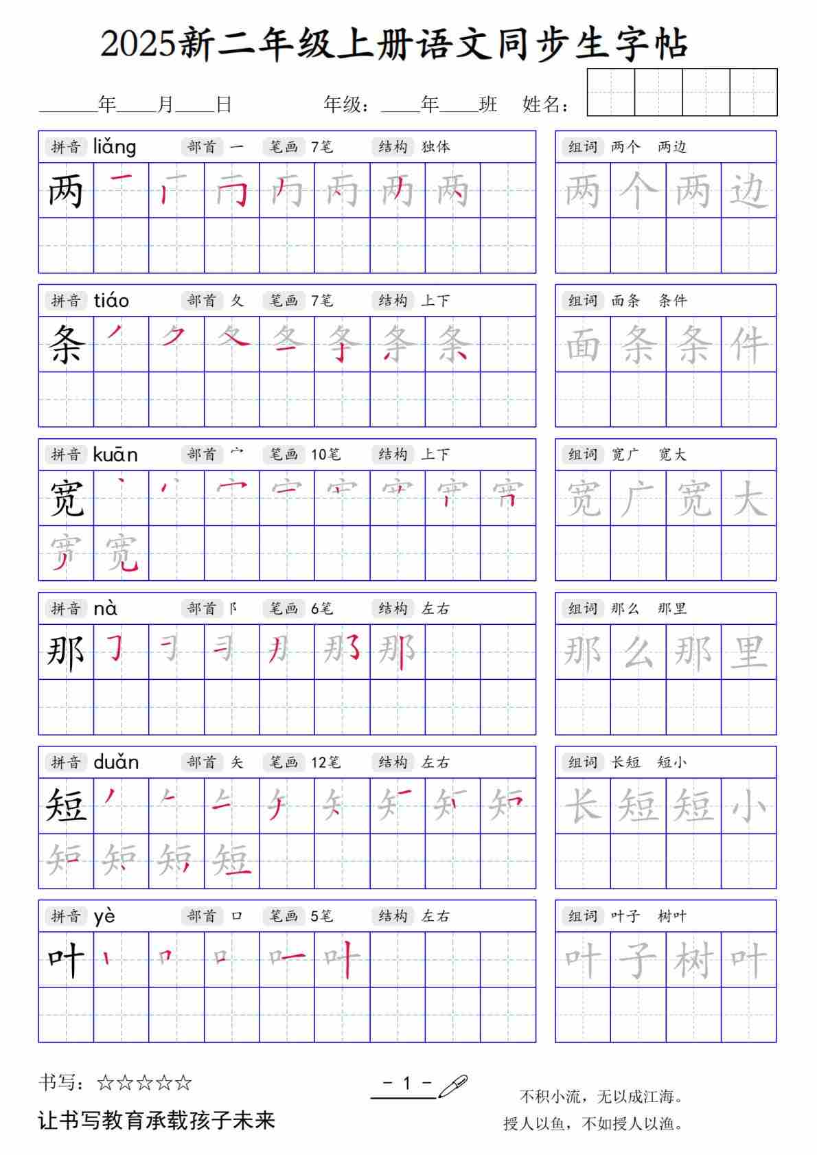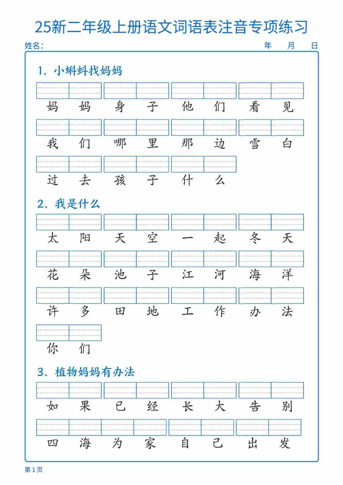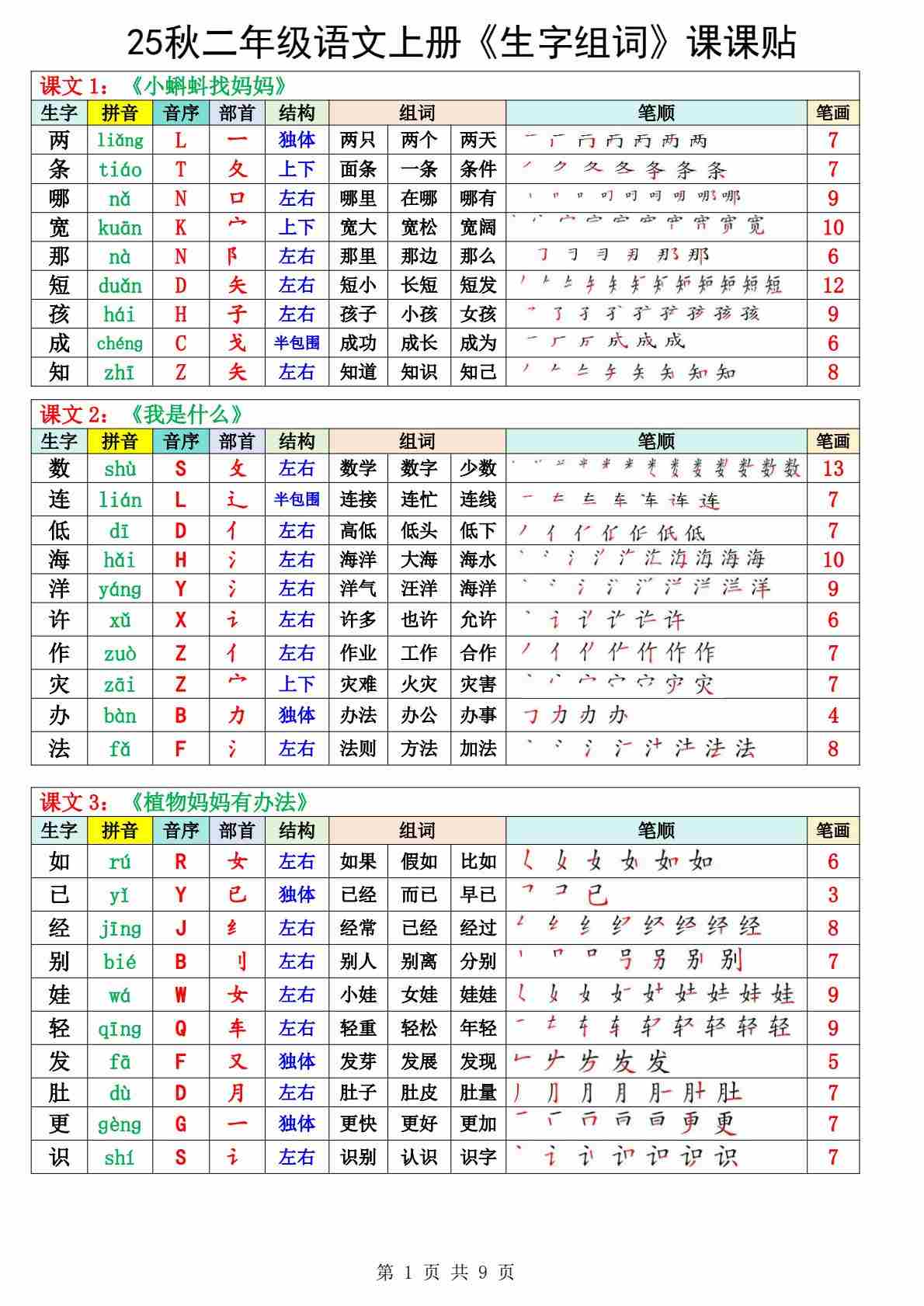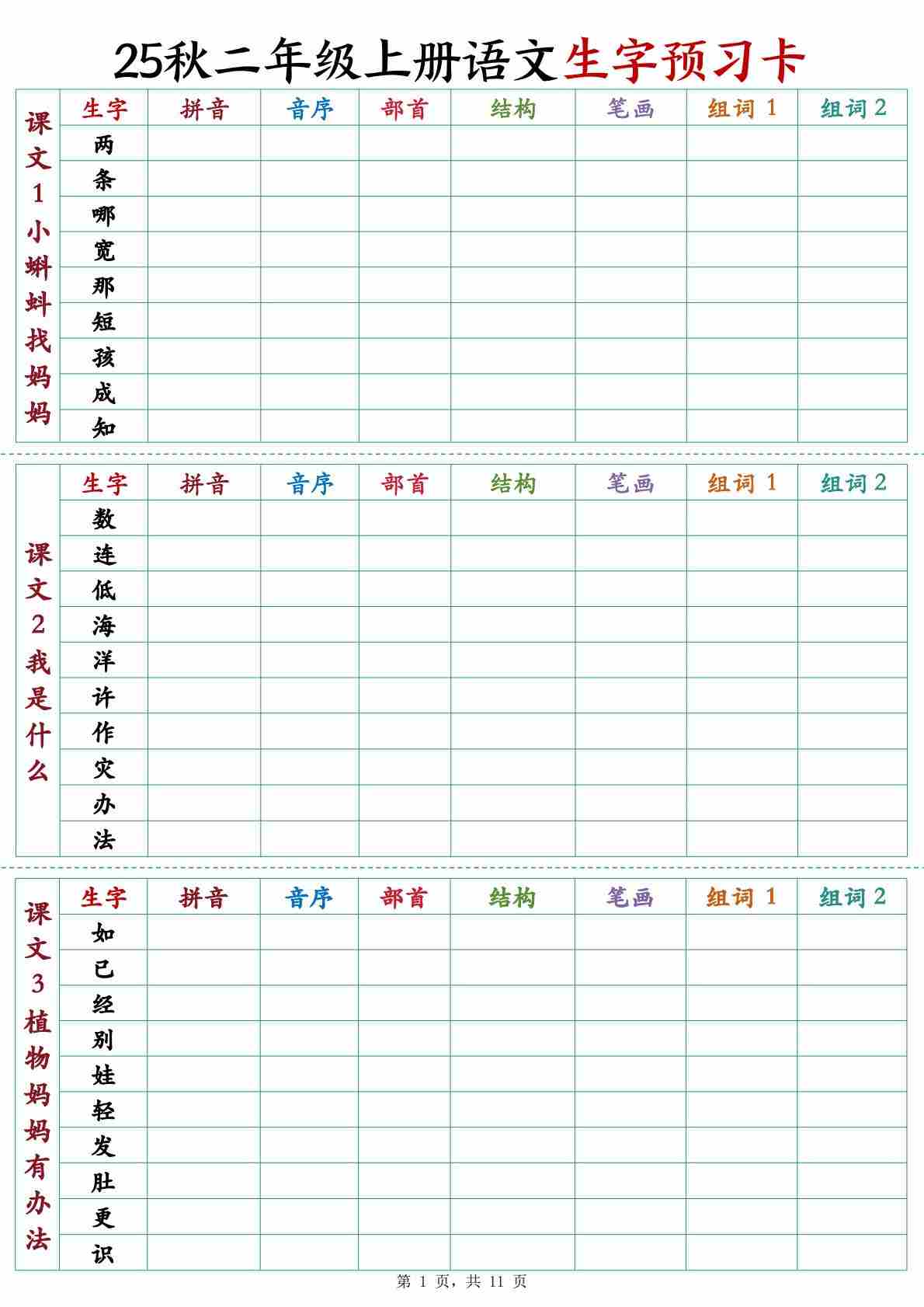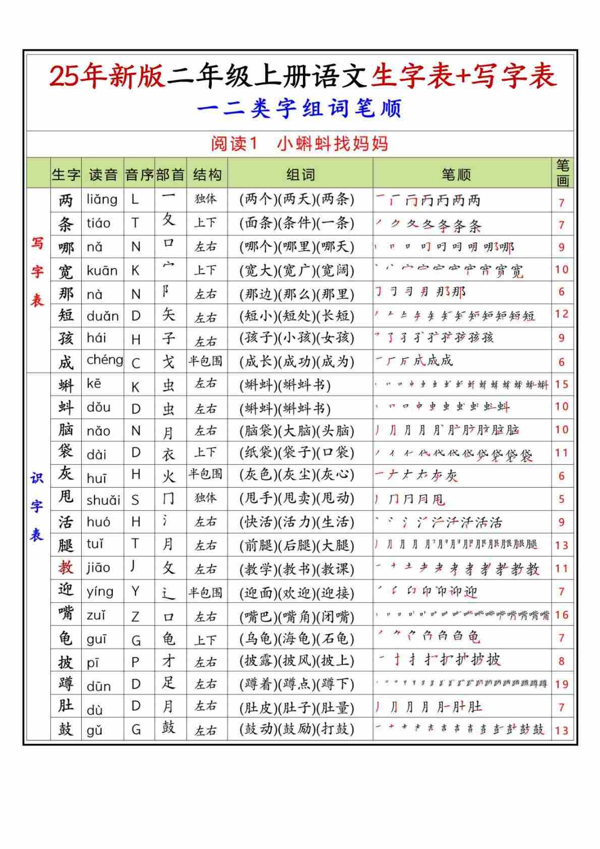 二(上)语文25年新版:一二类生字组词笔顺30页