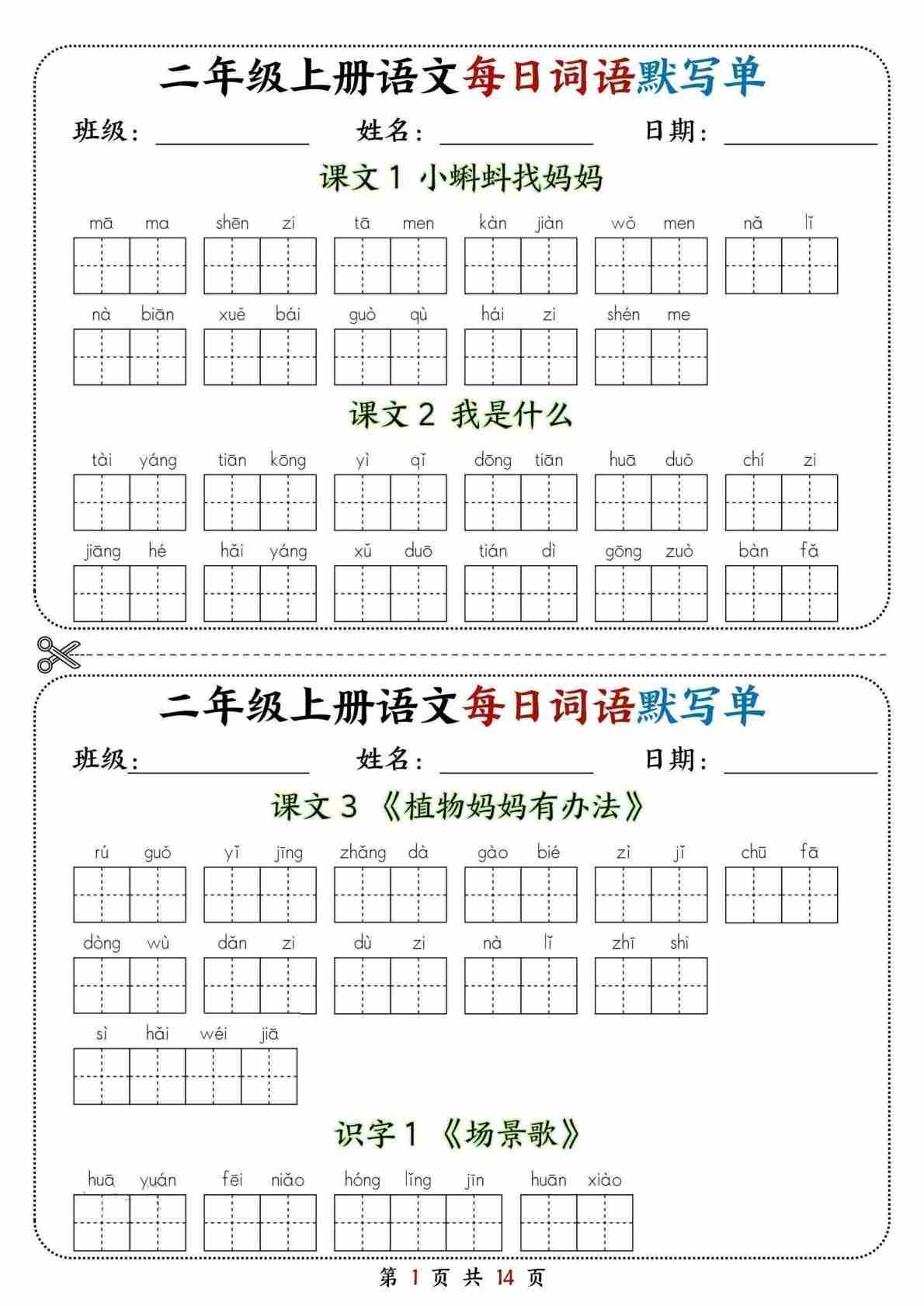 二(上)语文2025秋每日词语默写单(含答案14页)