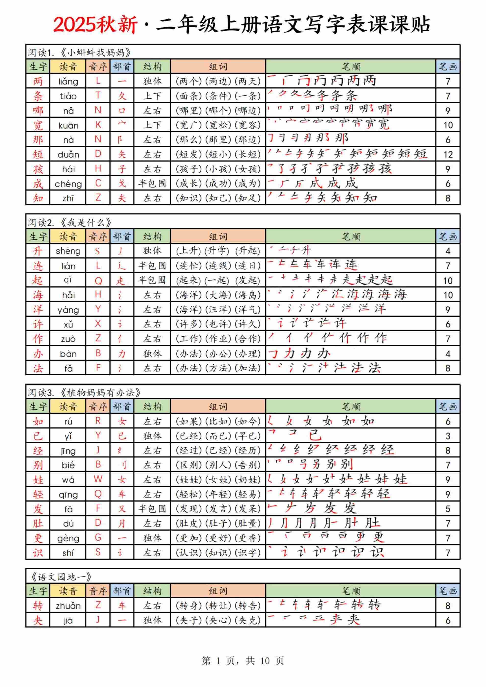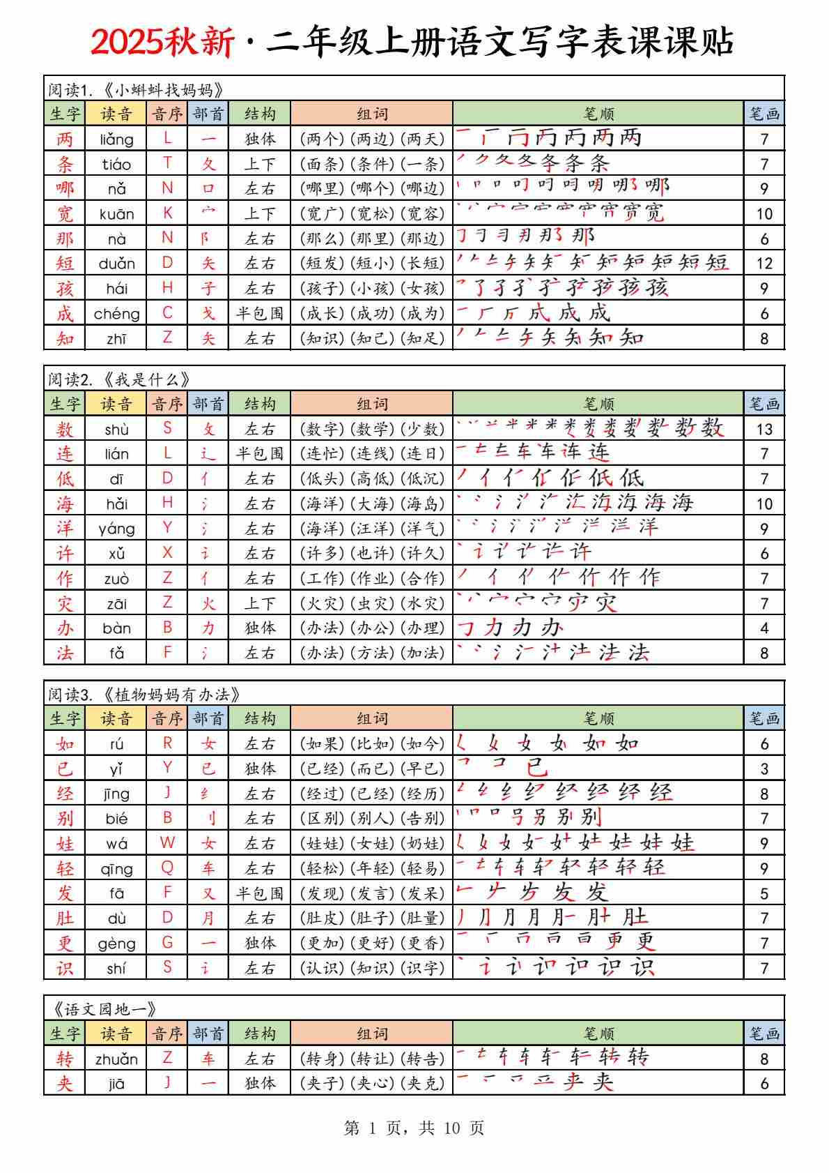 二(上)语文25年秋新改版:写字表课课贴(10页)