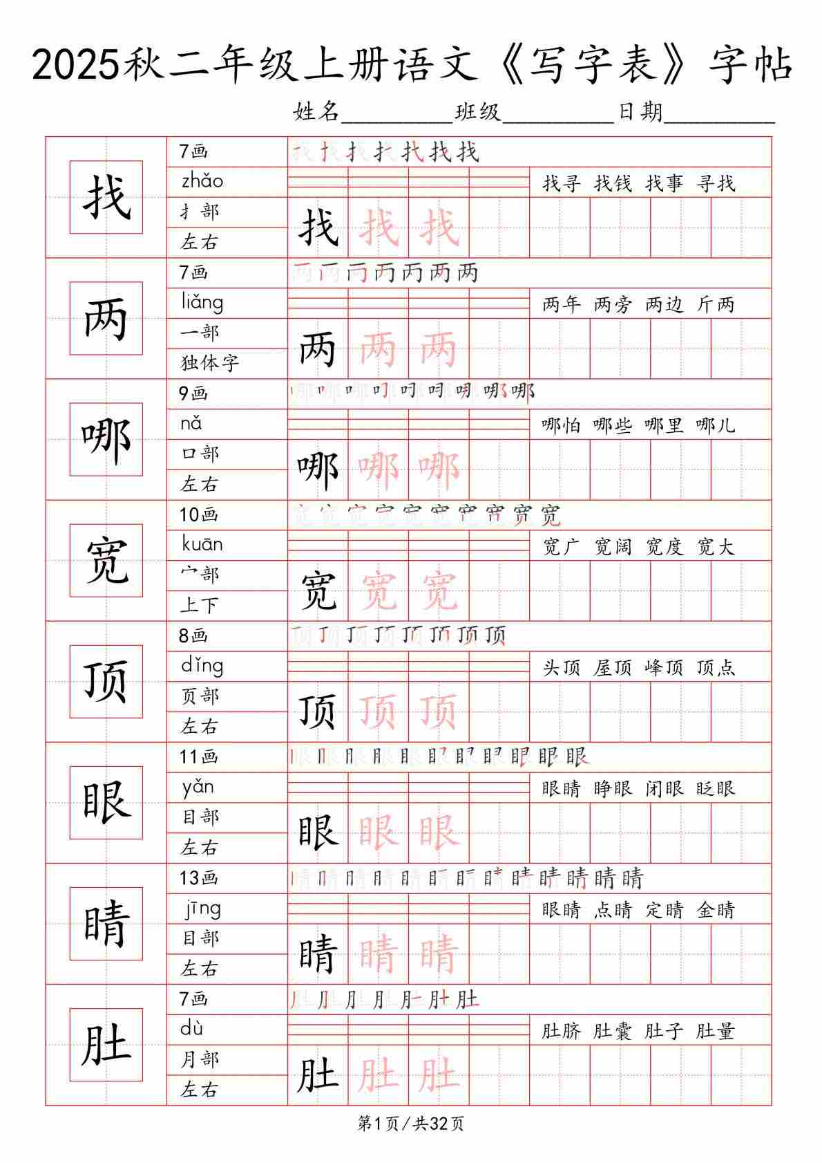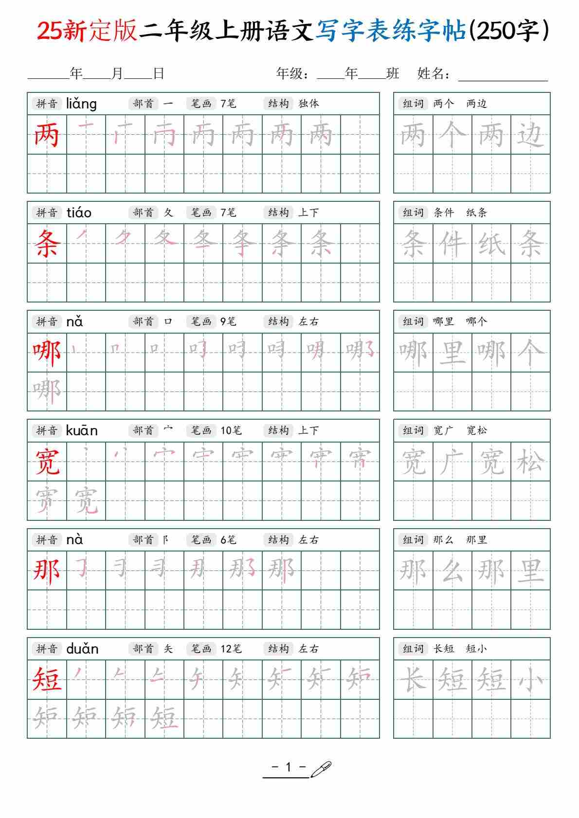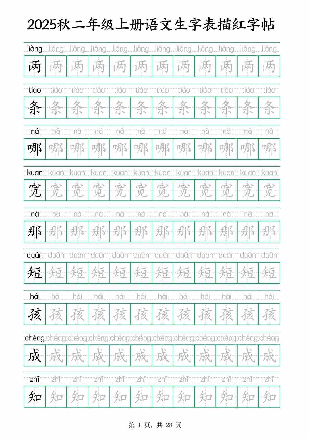 二(上)语文25秋新生字表生字拼音描红字帖(251字28页)