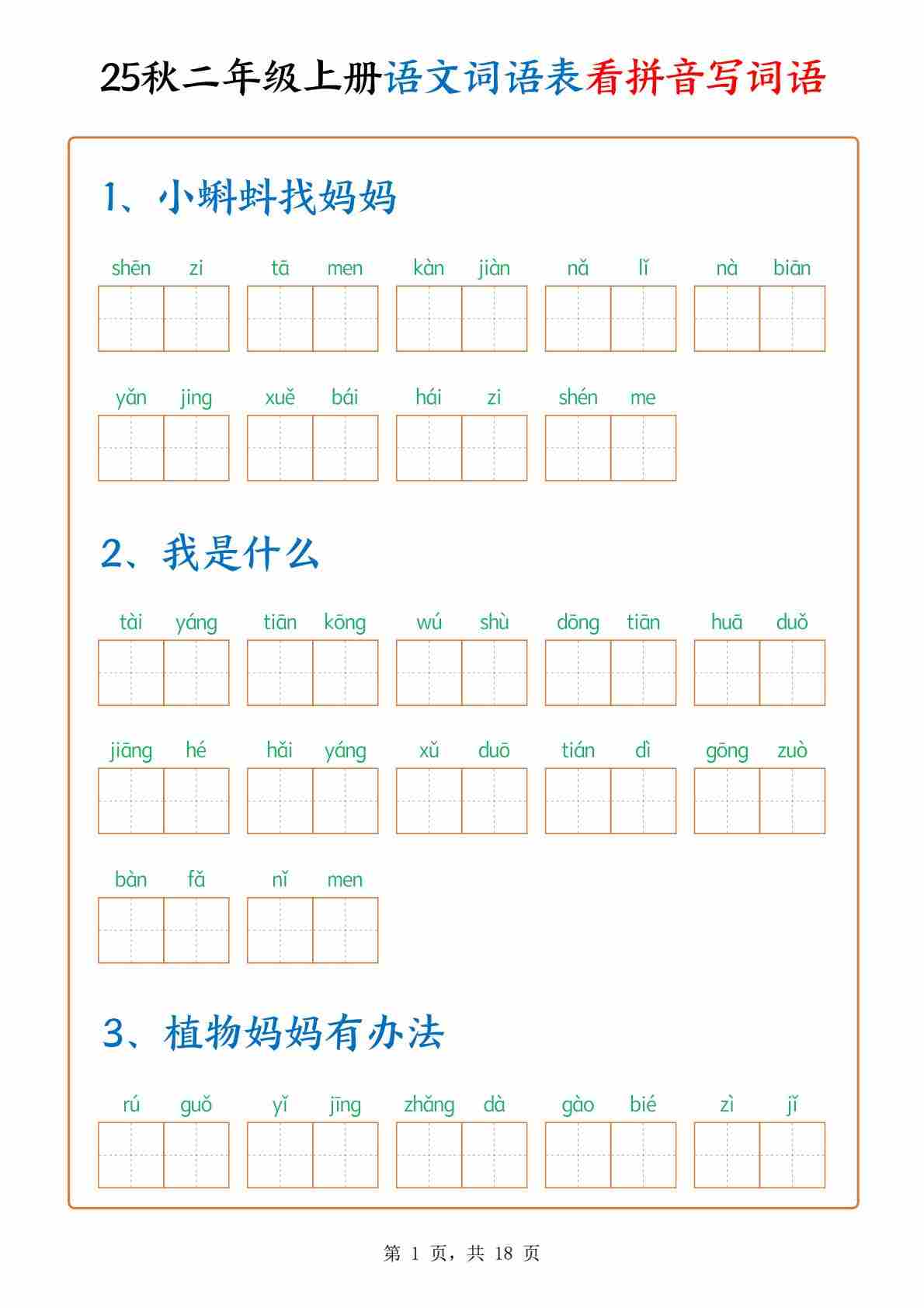 二(上)语文25秋词语表看拼音写词语(含答案18页)
