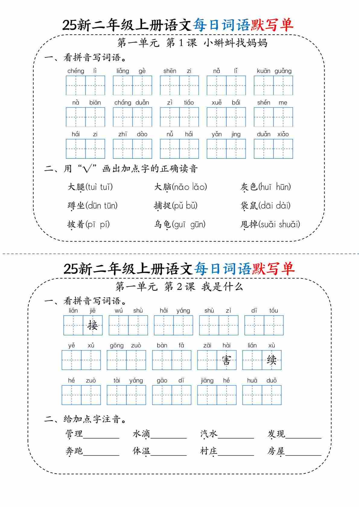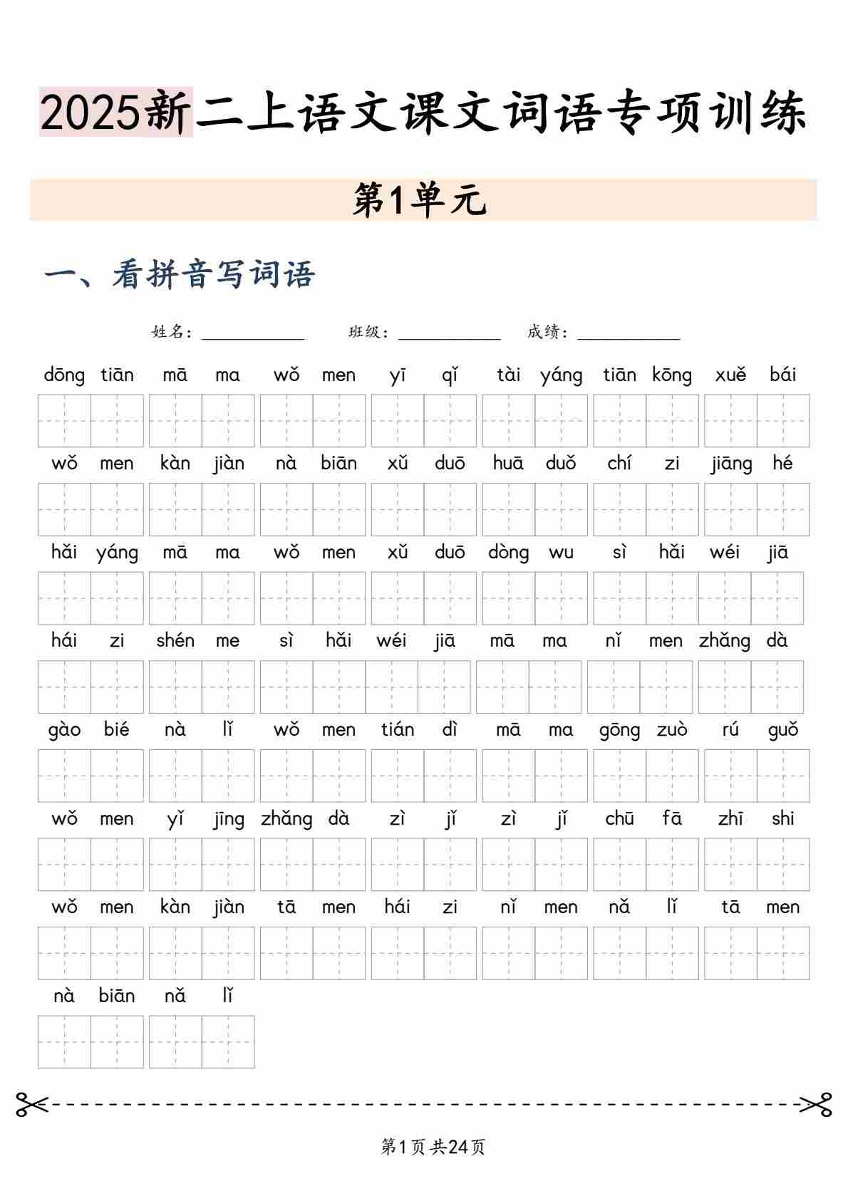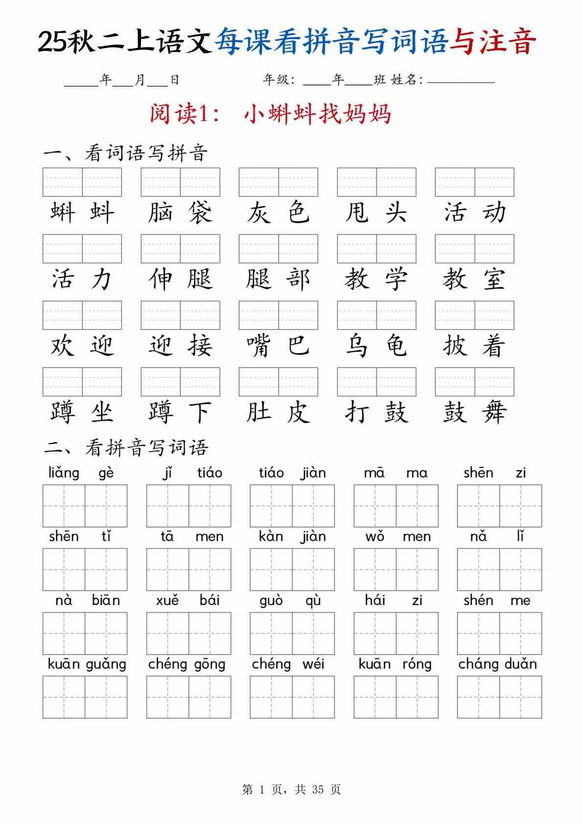 二(上)语文【25秋全册每课看拼音写词语与注音(35页)