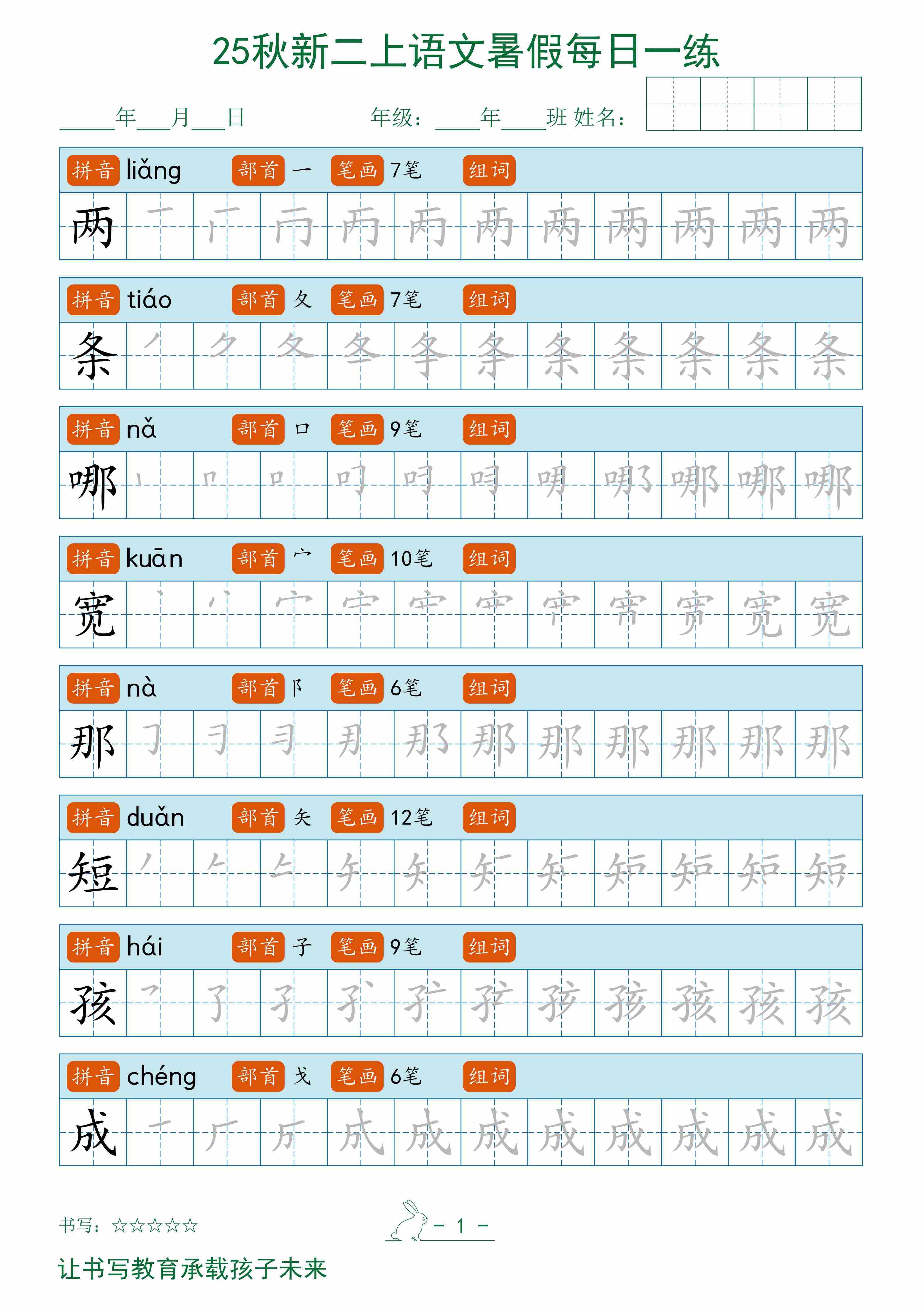 二(上)语文【2025秋新-暑假每日一练笔顺字帖】