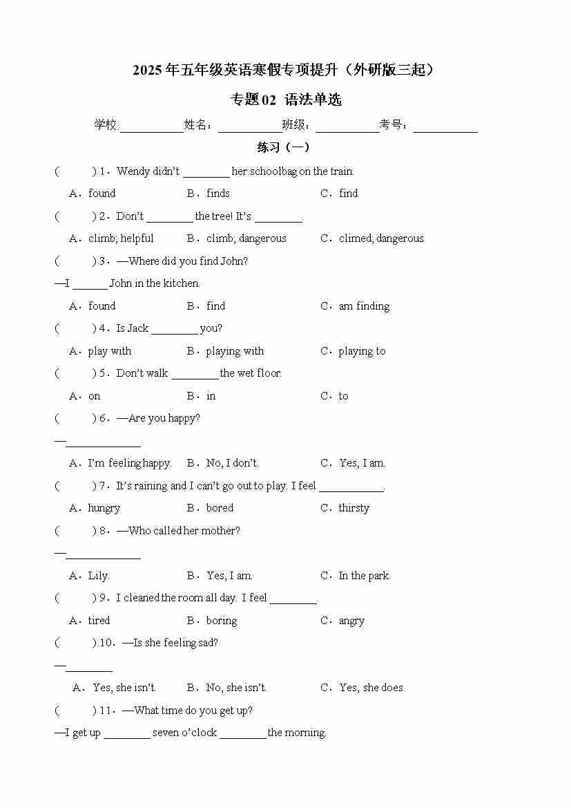 ①寒假复习-专题02 语法单选(学生版)-2025年五年级英语寒假衔接讲练 (外研版三起)