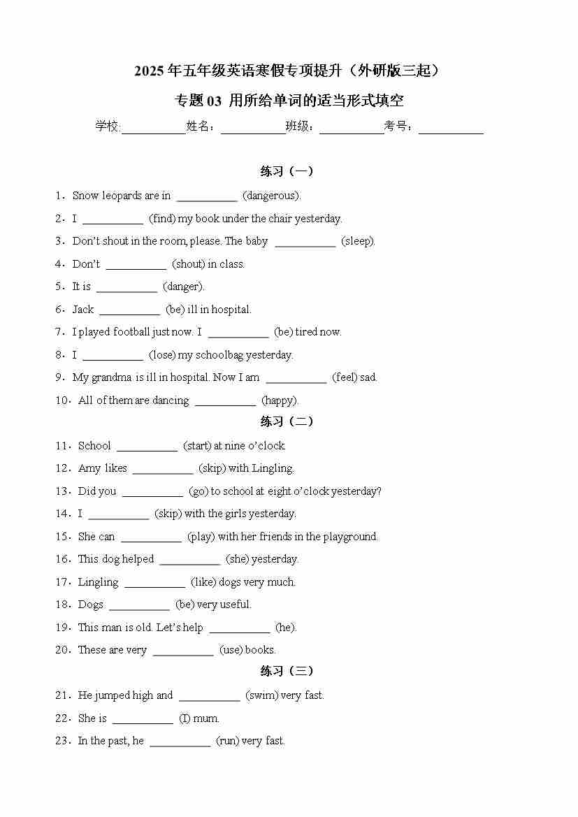 ①寒假复习-专题03 用所给单词的适当形式填空(学生版)-2025年五年级英语寒假衔接讲练 (外研版三起)