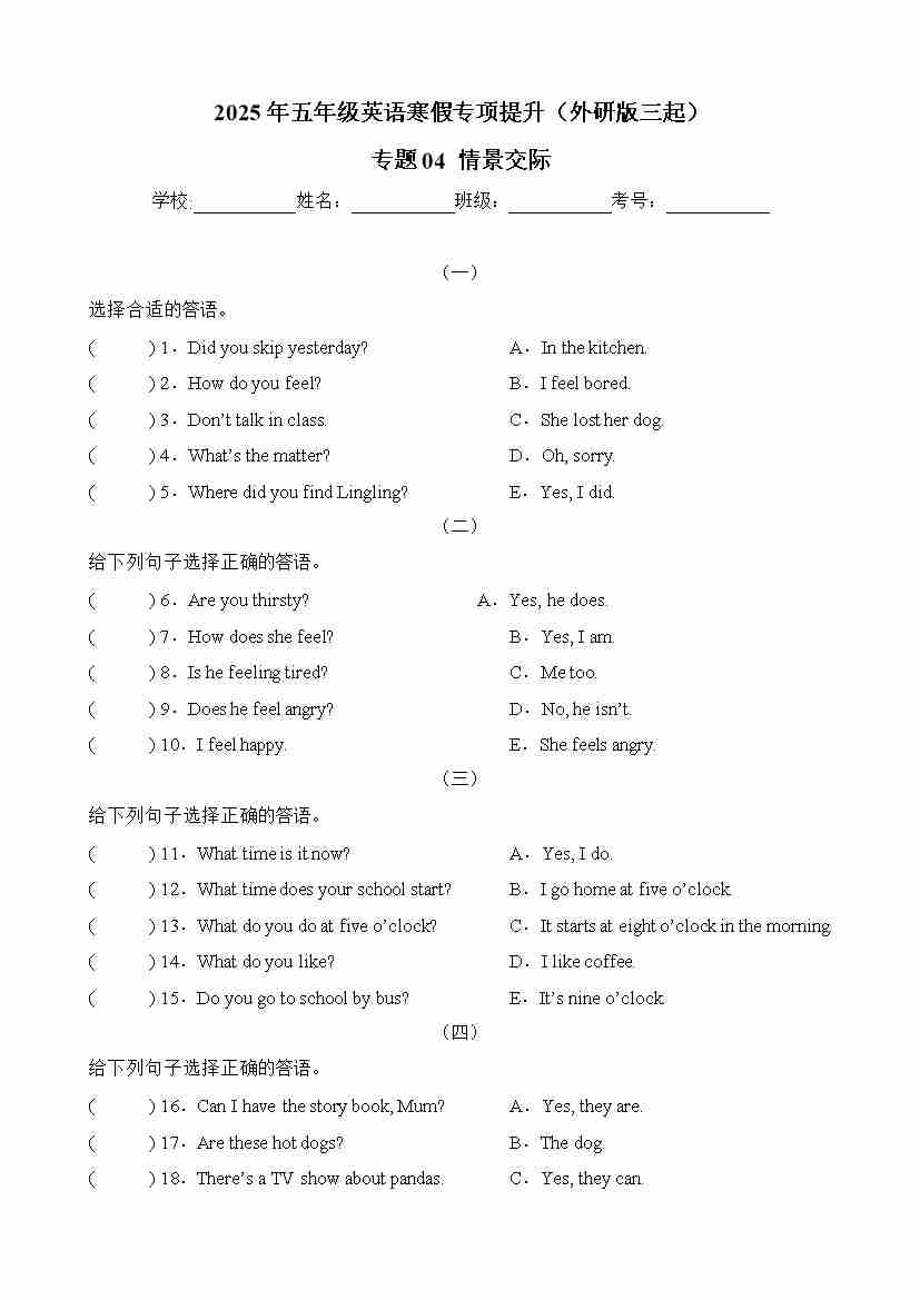 ①寒假复习-专题04 情景交际(学生版)-2025年五年级英语寒假衔接讲练 (外研版三起)