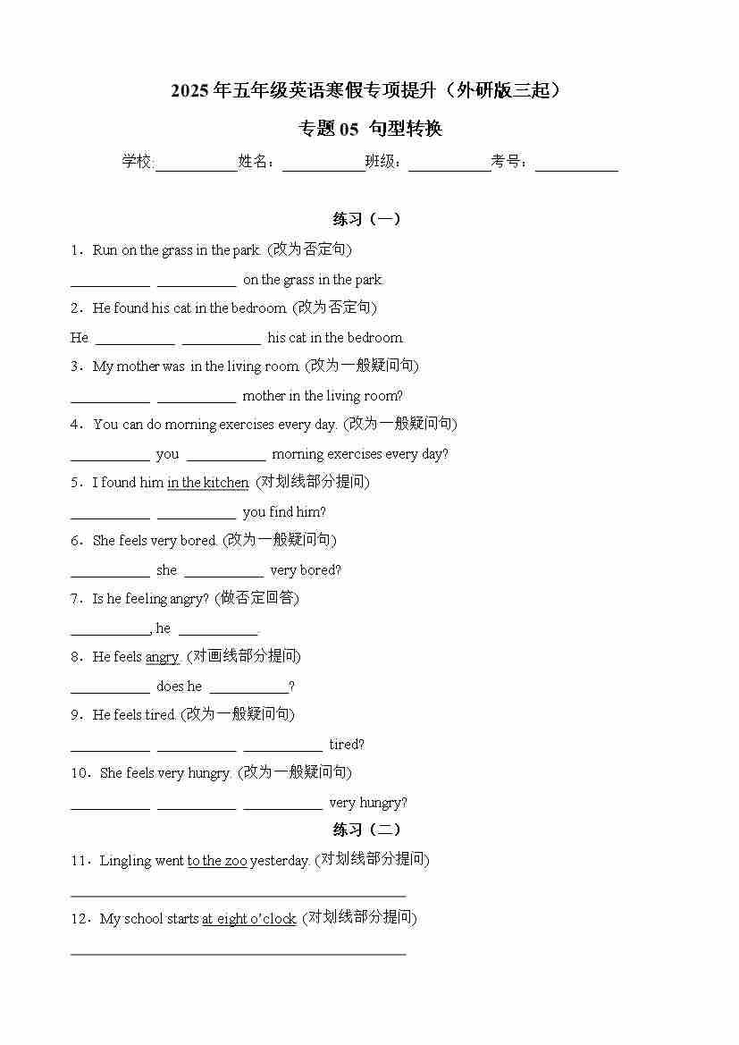 ①寒假复习-专题05 句型转换(学生版)-2025年五年级英语寒假衔接讲练 (外研版三起)