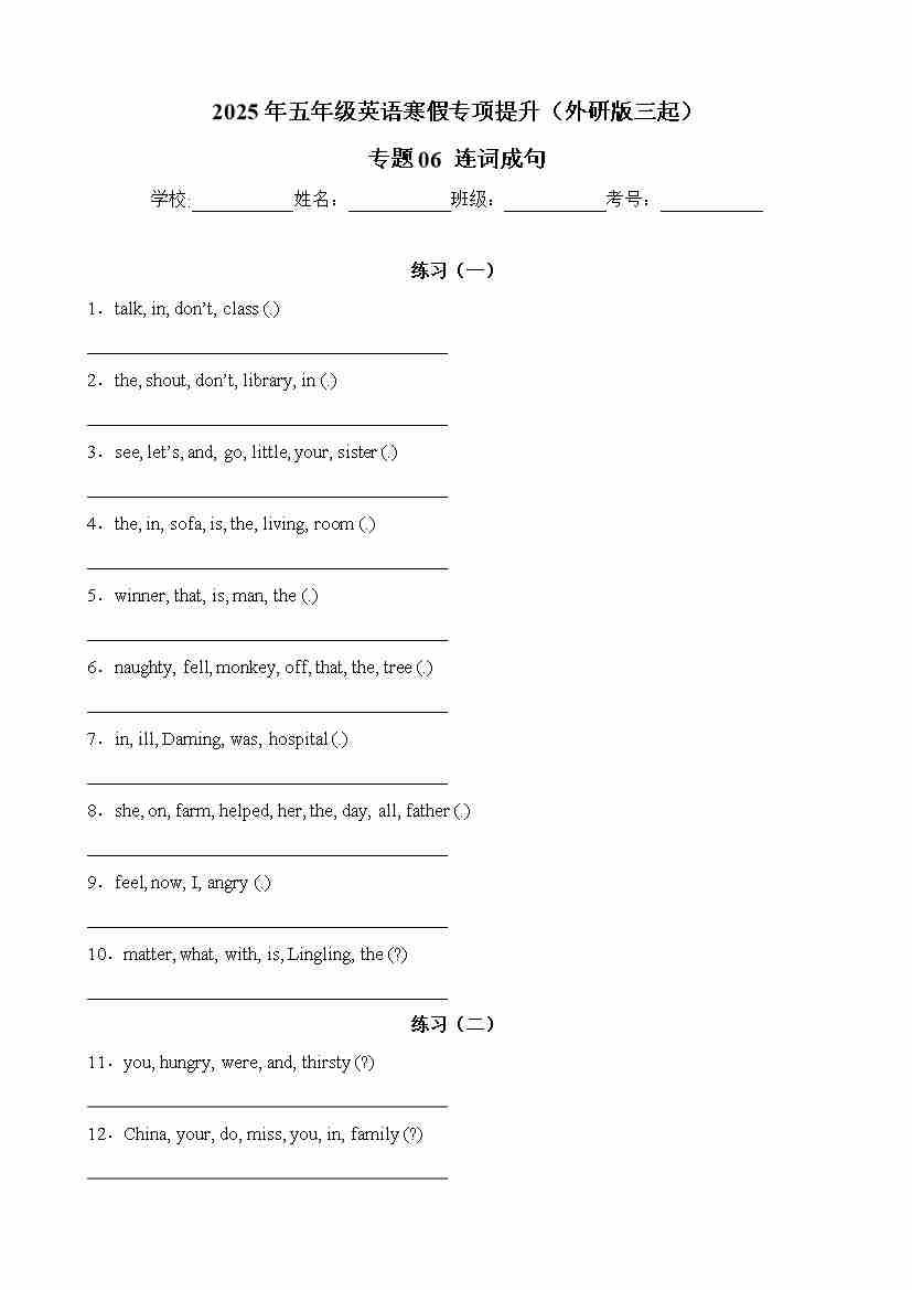 ①寒假复习-专题06 连词成句(学生版)-2025年五年级英语寒假衔接讲练 (外研版三起)