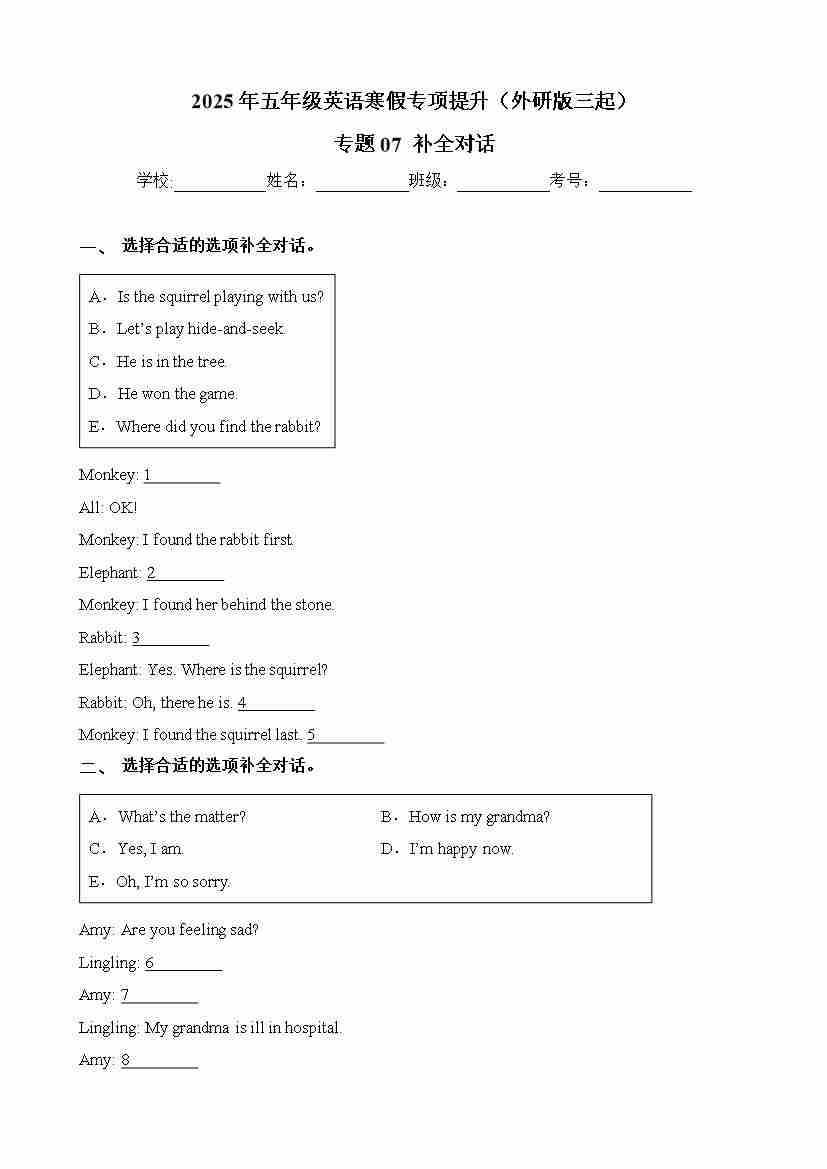 ①寒假复习-专题07 补全对话(学生版)-2025年五年级英语寒假衔接讲练 (外研版三起)