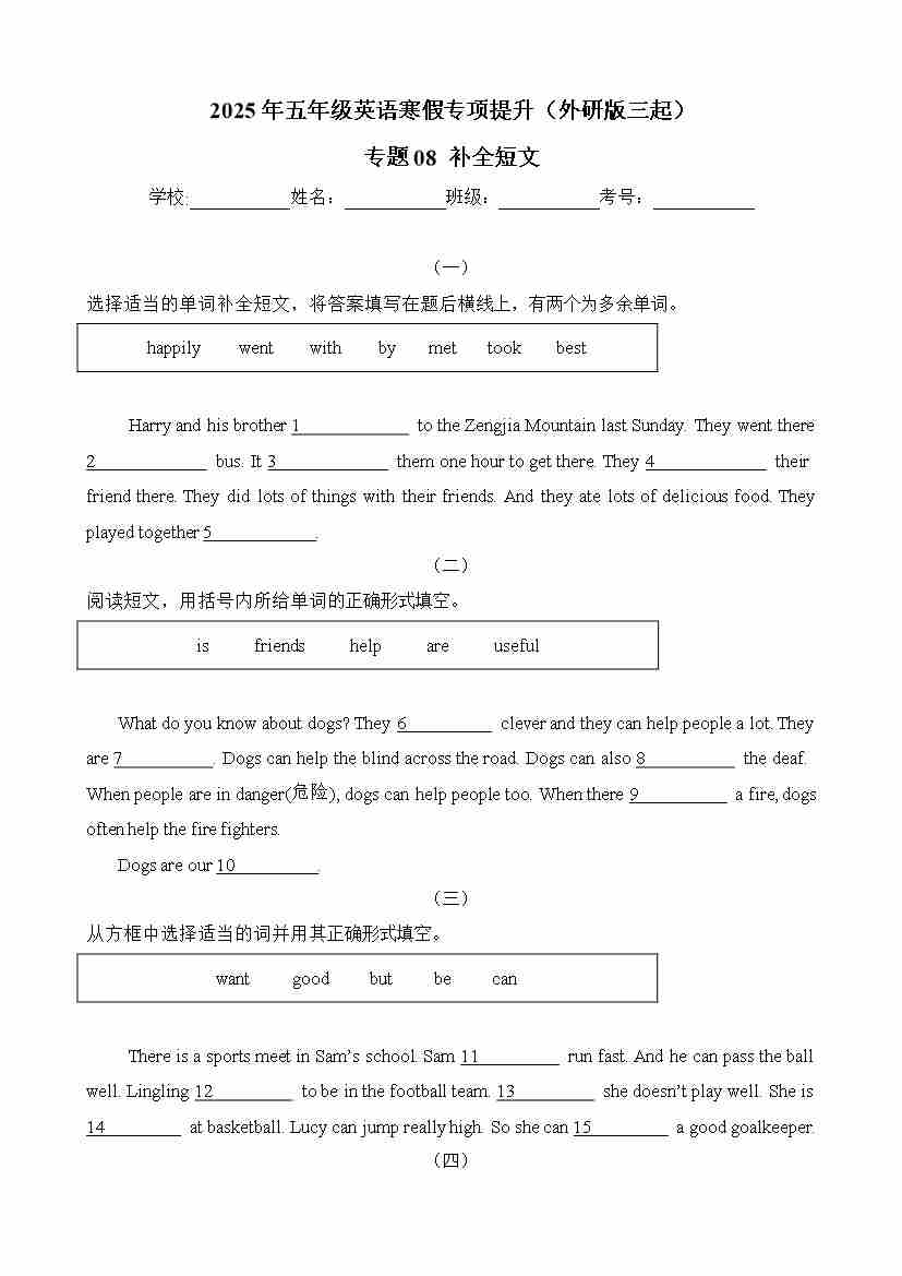 ①寒假复习-专题08 补全短文(学生版)-2025年五年级英语寒假衔接讲练 (外研版三起)