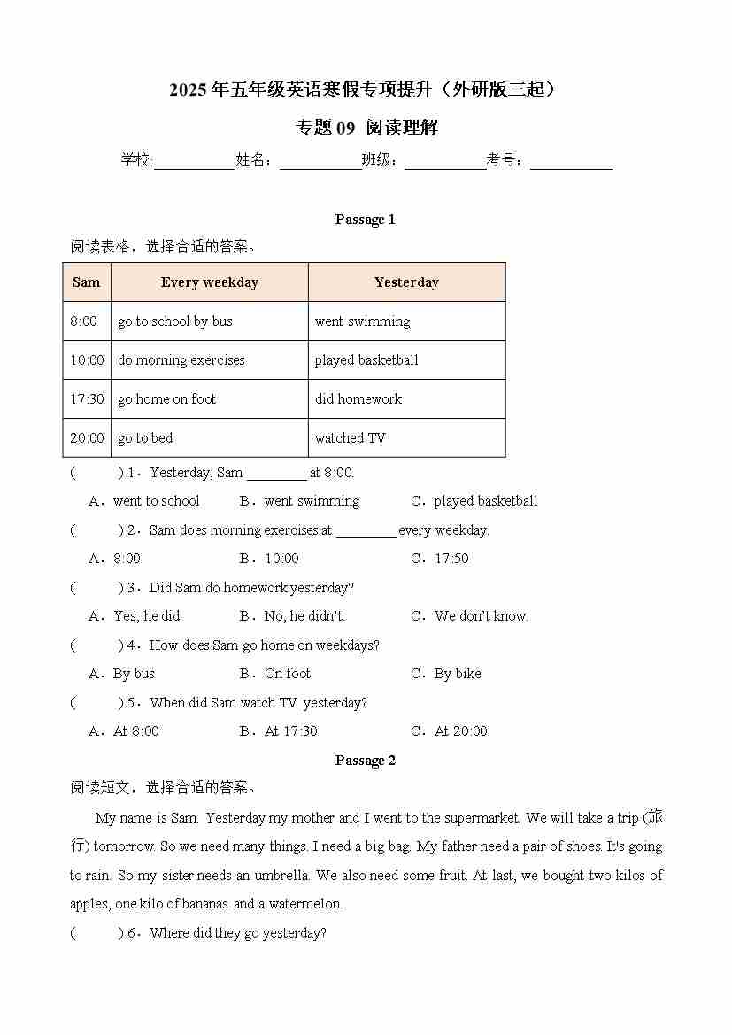 ①寒假复习-专题09 阅读理解(学生版)-2025年五年级英语寒假衔接讲练 (外研版三起)