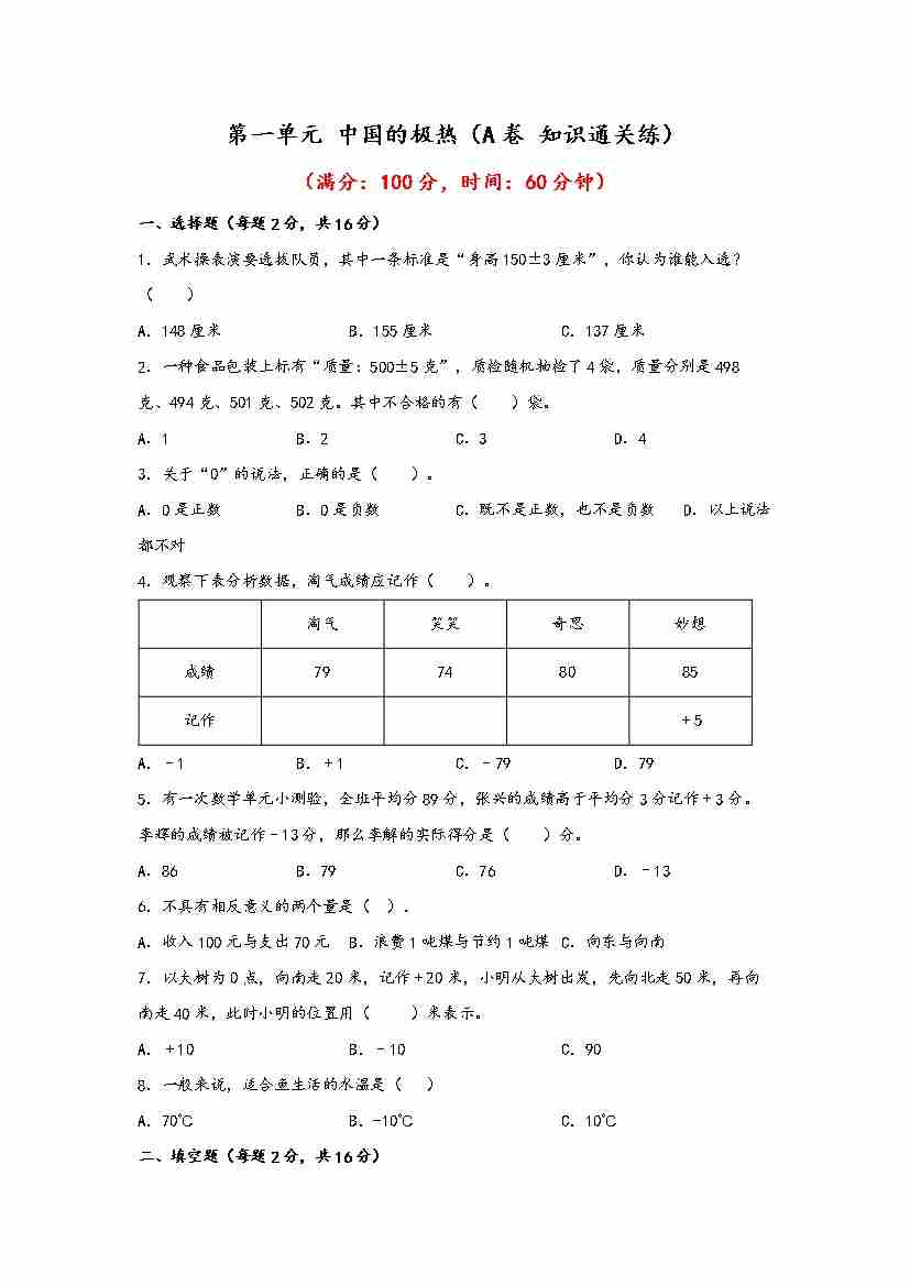 【单元检测】第一单元 中国的极热(A卷 知识通关练)五年级下册数学单元AB卷(青岛版,六三制)