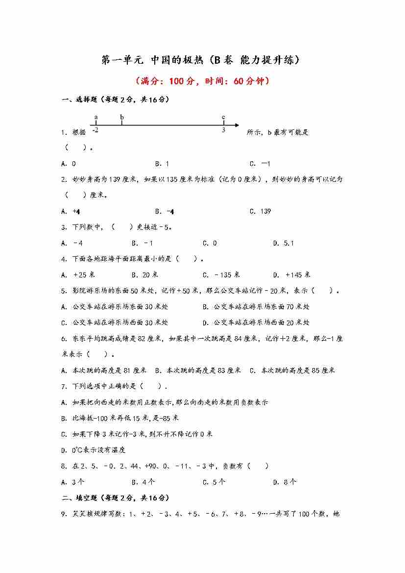 【单元检测】第一单元 中国的极热(B卷 能力提升练)五年级下册数学单元AB卷(青岛版,六三制)