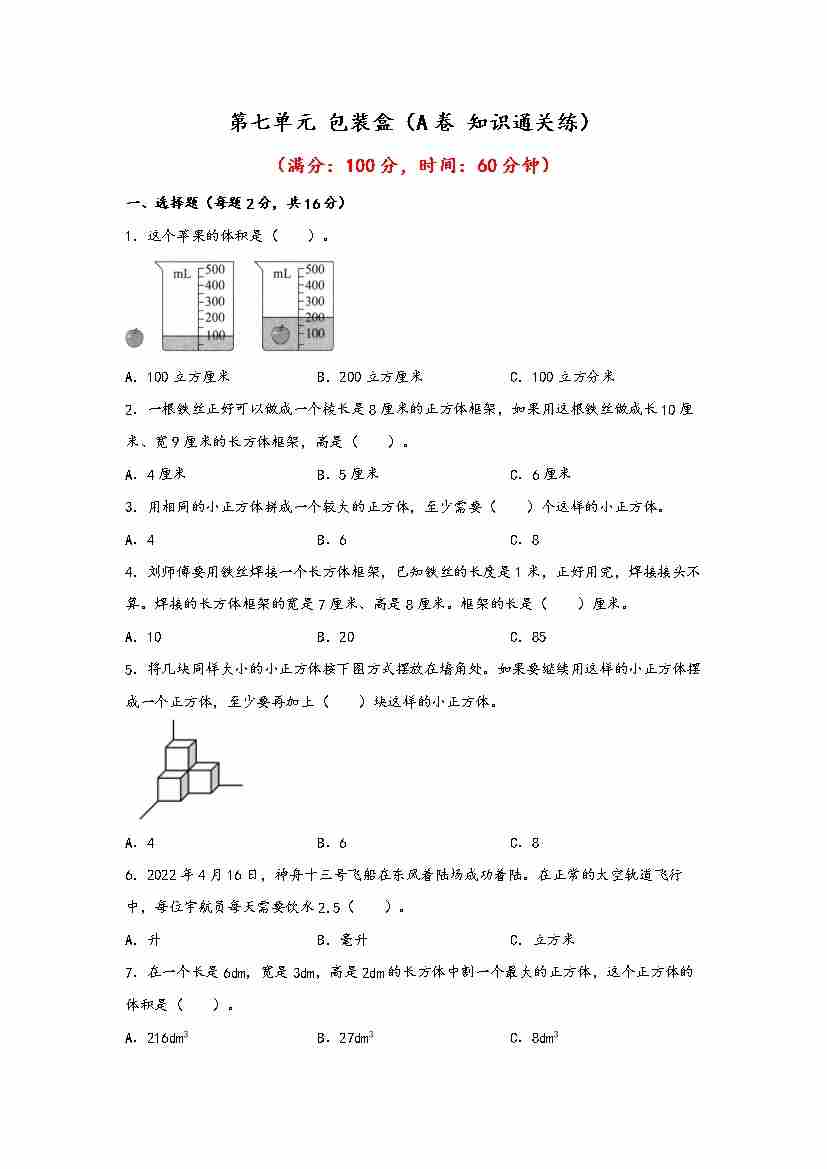 【单元检测】第七单元 包装盒(A卷 知识通关练)五年级下册数学单元AB卷(青岛版,六三制)