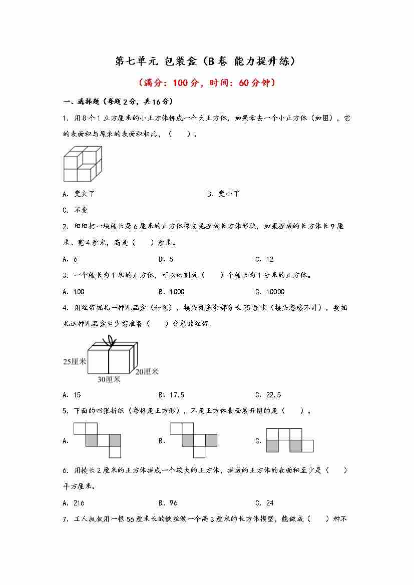 【单元检测】第七单元 包装盒(B卷 能力提升练)五年级下册数学单元AB卷(青岛版,六三制)