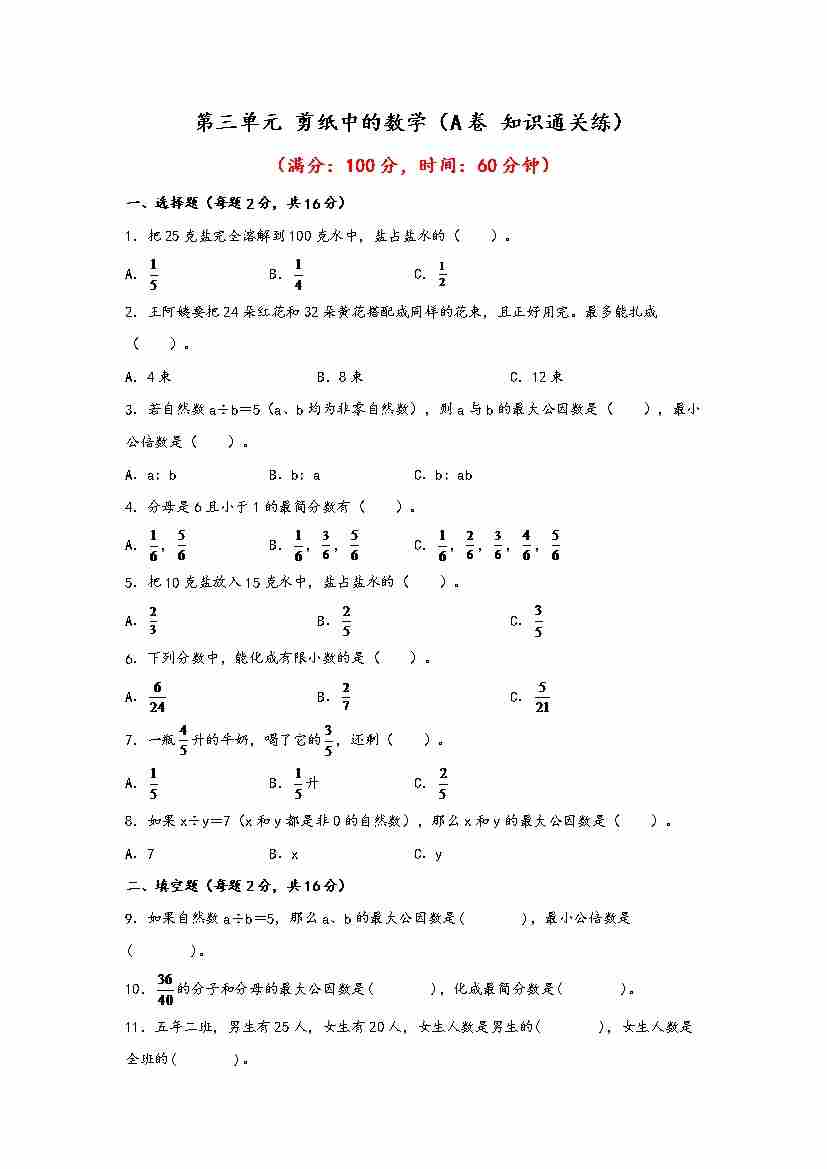 【单元检测】第三单元 剪纸中的数学(A卷 知识通关练)五年级下册数学单元AB卷(青岛版,六三制)