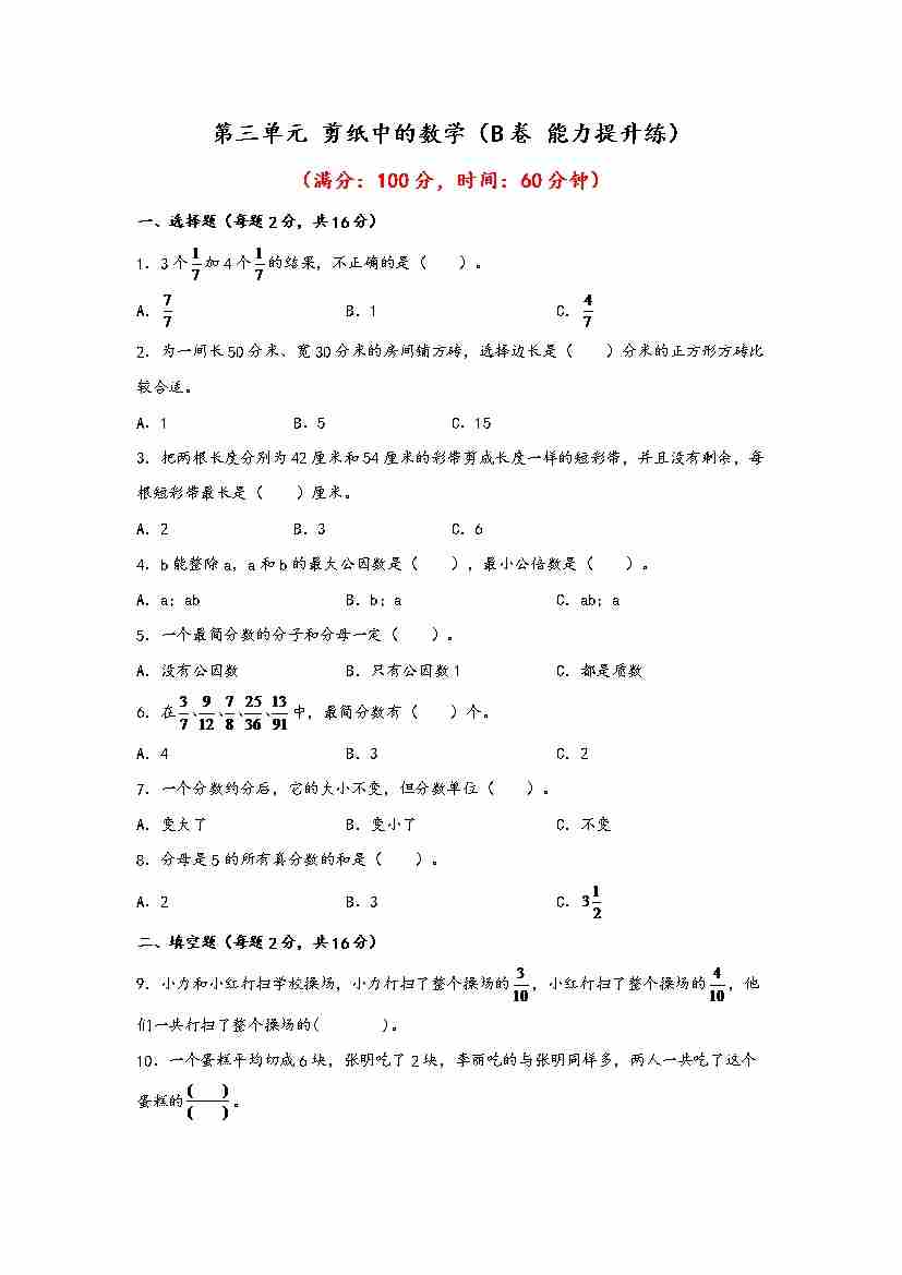【单元检测】第三单元 剪纸中的数学(B卷 能力提升练)五年级下册数学单元AB卷(青岛版,六三制)