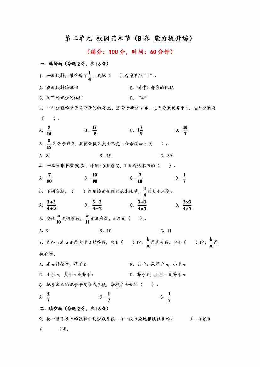 【单元检测】第二单元 校园艺术节(B卷 能力提升练)五年级下册数学单元AB卷(青岛版,六三制)
