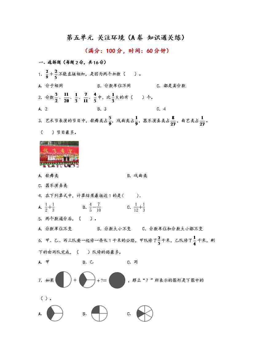 【单元检测】第五单元 关注环境(A卷 知识通关练)五年级下册数学单元AB卷(青岛版,六三制)