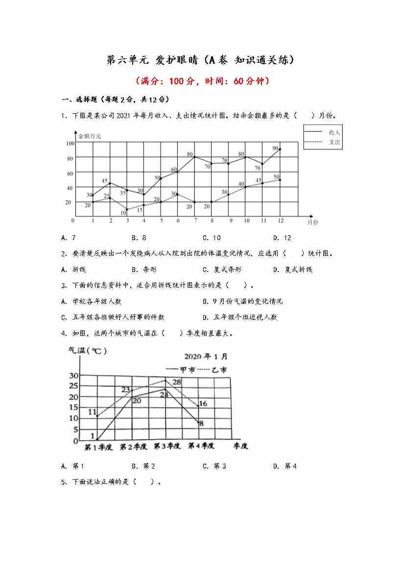 【单元检测】第六单元 爱护眼睛(A卷 知识通关练)五年级下册数学单元AB卷(青岛版,六三制)