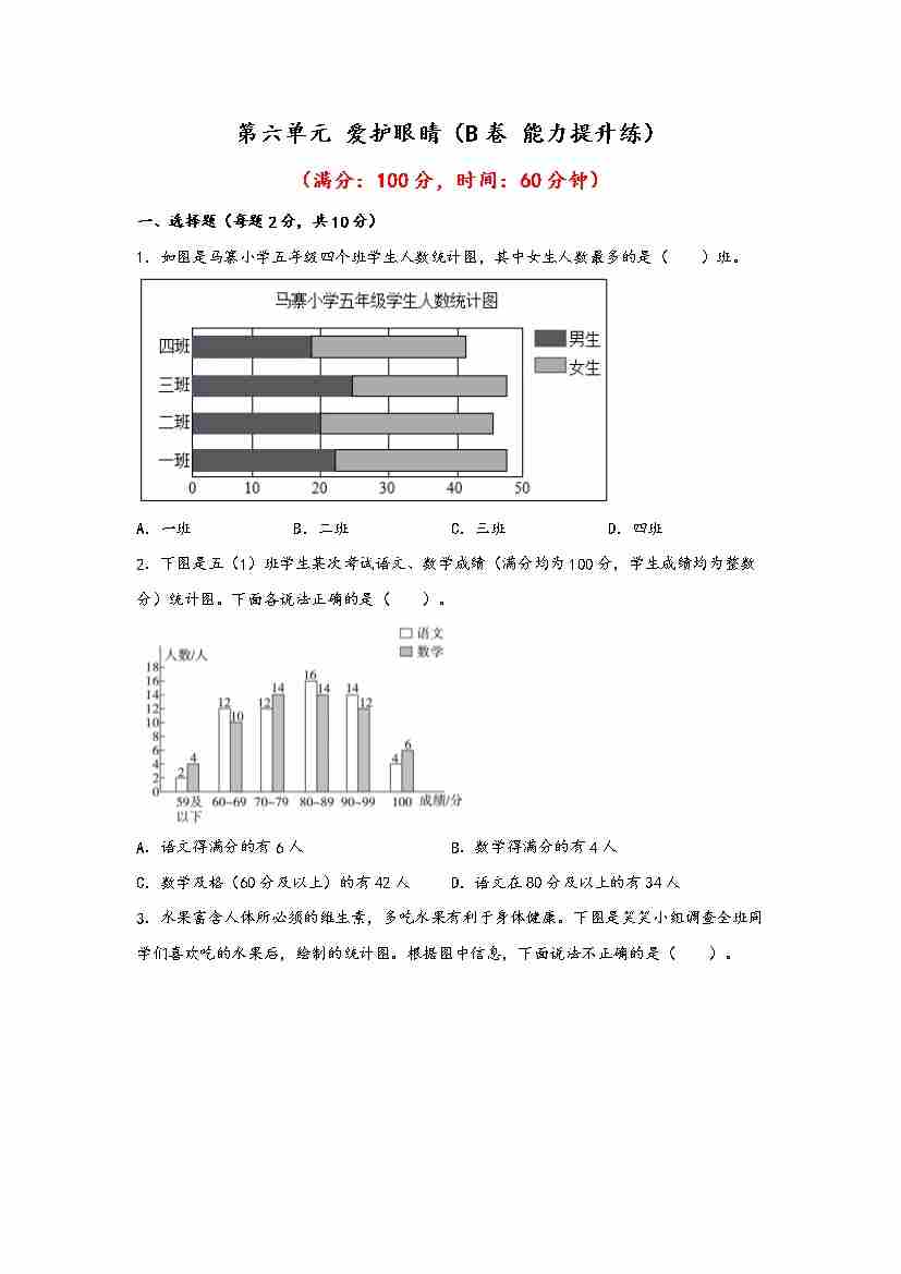 【单元检测】第六单元 爱护眼睛(B卷 能力提升练)五年级下册数学单元AB卷(青岛版,六三制)