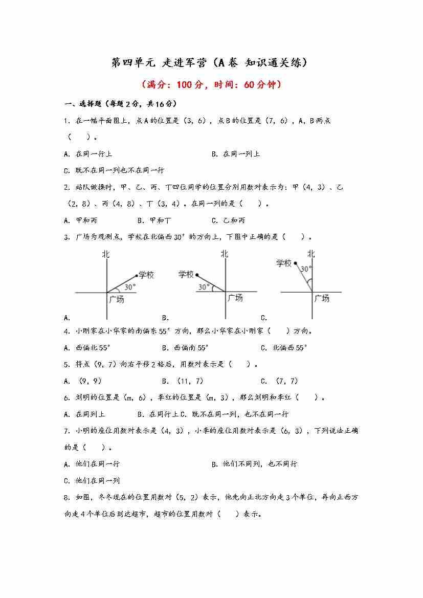 【单元检测】第四单元 走进军营(A卷 知识通关练)五年级下册数学单元AB卷(青岛版,六三制)