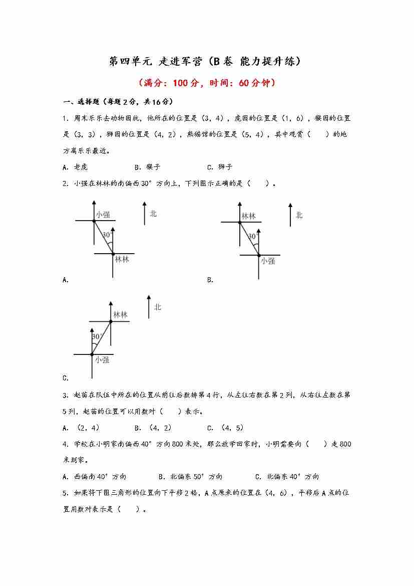 【单元检测】第四单元 走进军营(B卷 能力提升练)五年级下册数学单元AB卷(青岛版,六三制)