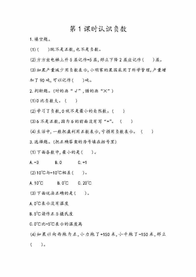 【青岛63制】五(下)数学课时练:1.1 认识负数