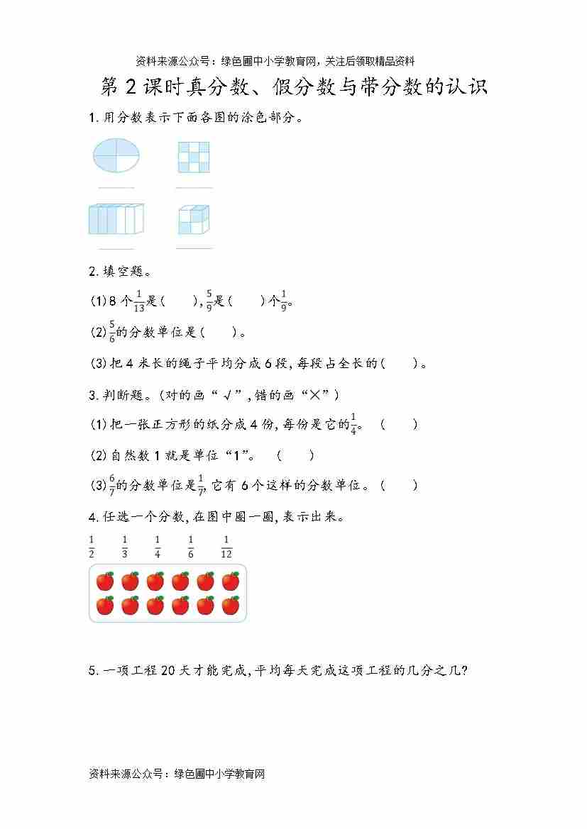 【青岛63制】五(下)数学课时练:2.1 单位“1”的含义和分数的意义