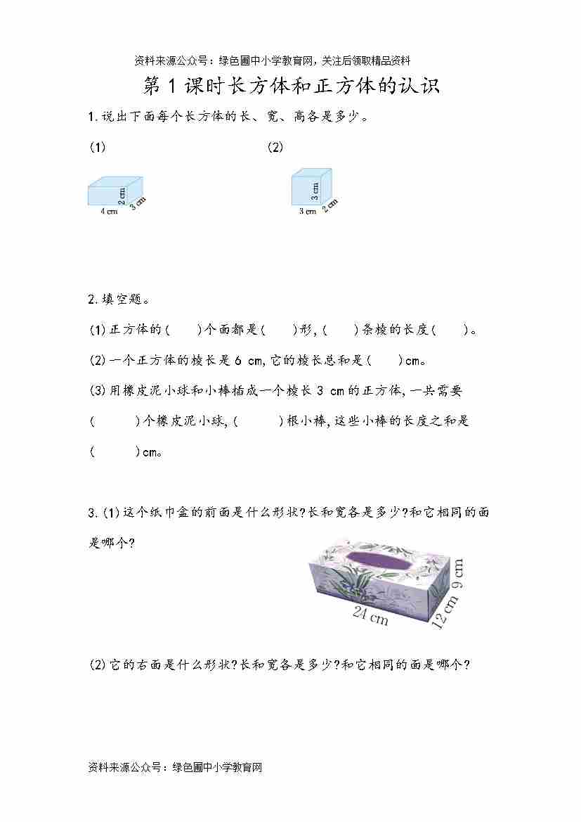 【青岛63制】五(下)数学课时练:7.1 长方体和正方体的认识