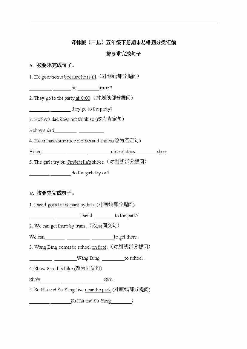 【期末易错题分类汇编】按要求完成句子 译林版(三起) 五年级下册