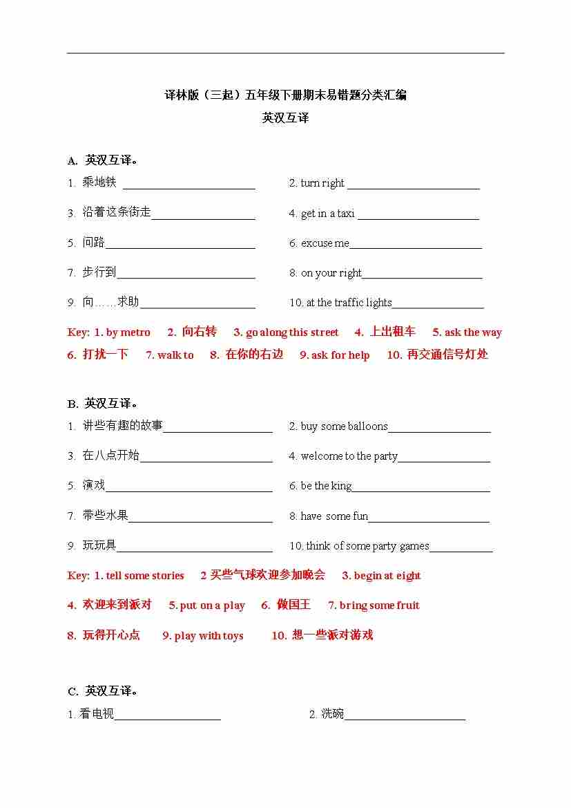 【期末易错题分类汇编】英汉互译 译林版(三起) 五年级下册(答案版)