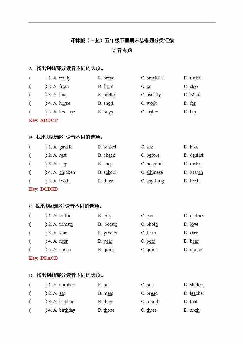 【期末易错题分类汇编】语音专题 译林版(三起) 五年级下册