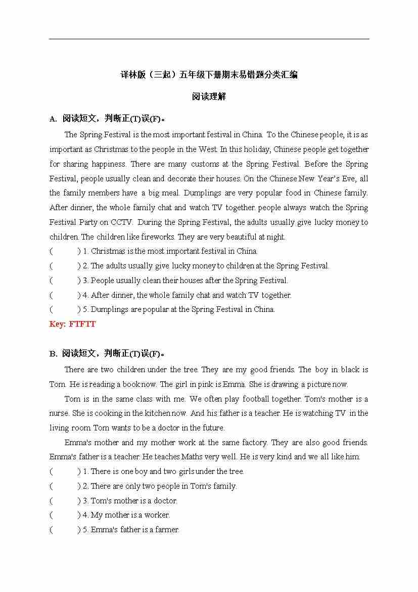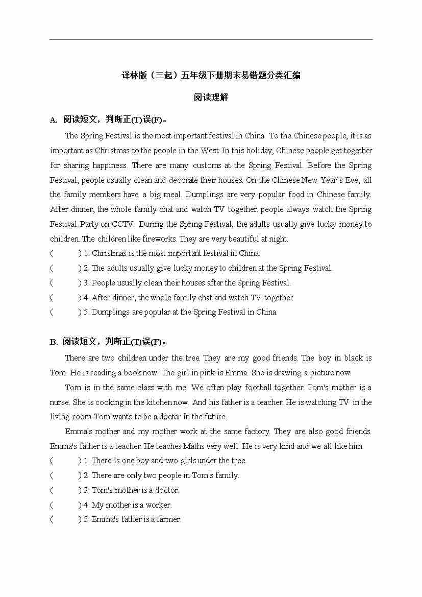 【期末易错题分类汇编】阅读理解(判断正误篇) 译林版(三起) 五年级下册