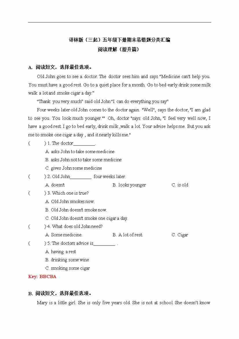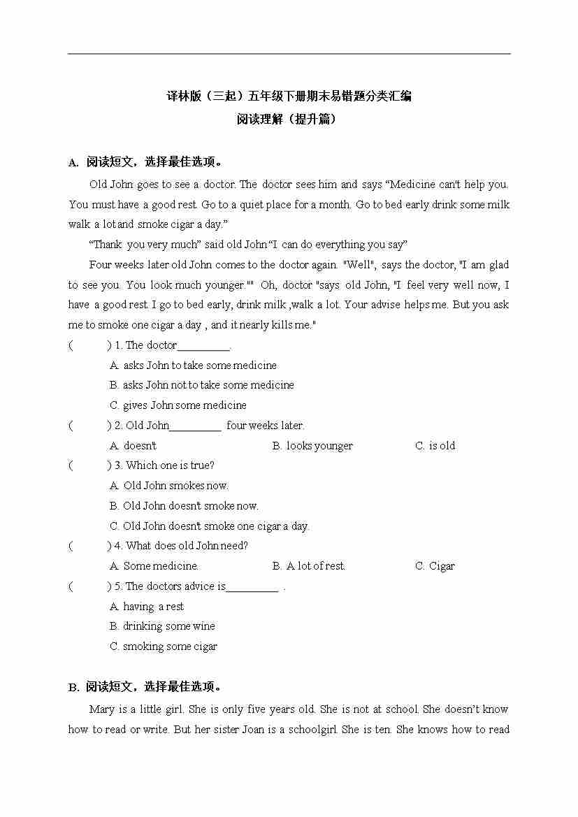 【期末易错题分类汇编】阅读理解(提升篇) 译林版(三起) 五年级下册
