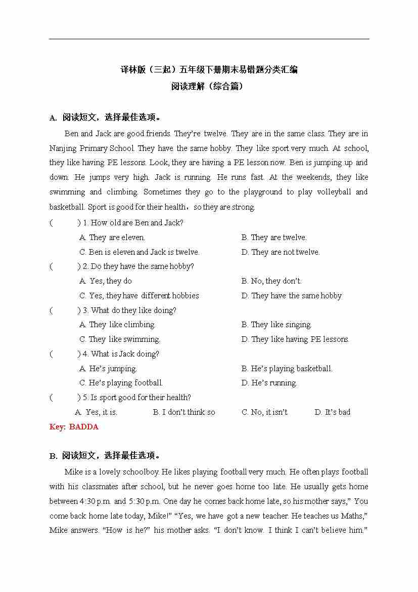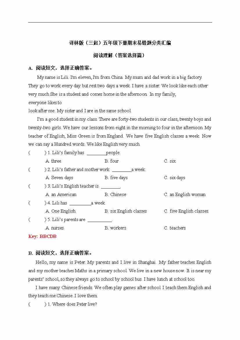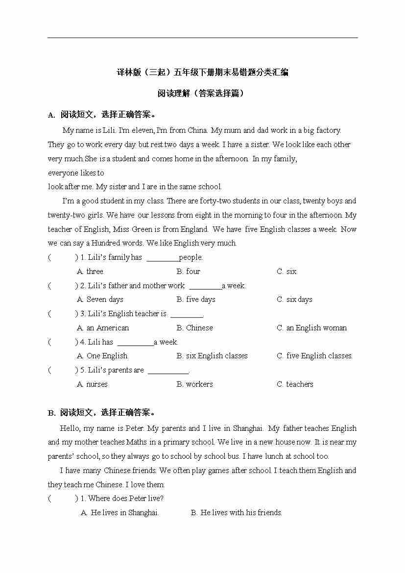 【期末易错题分类汇编】阅读理解(答案选择篇) 译林版(三起) 五年级下册