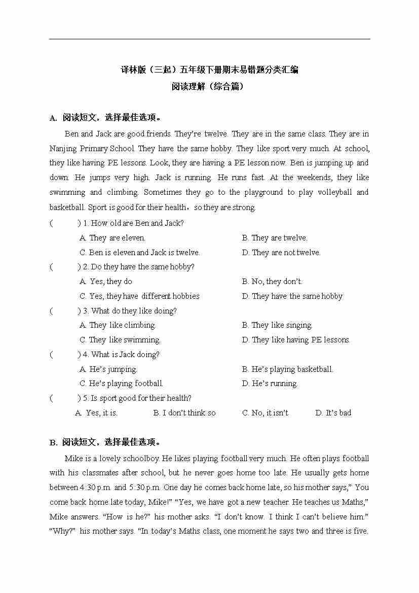 【期末易错题分类汇编】阅读理解(综合篇) 译林版(三起) 五年级下册