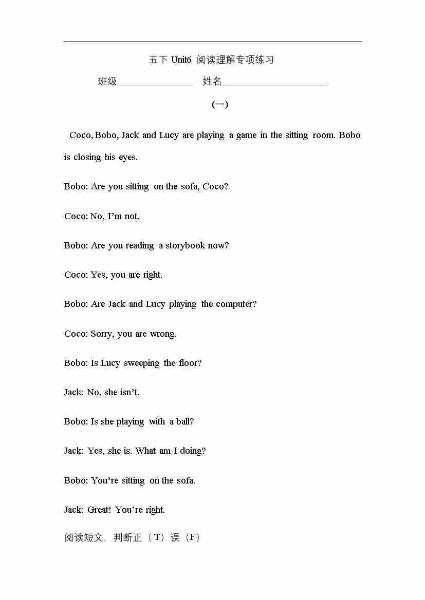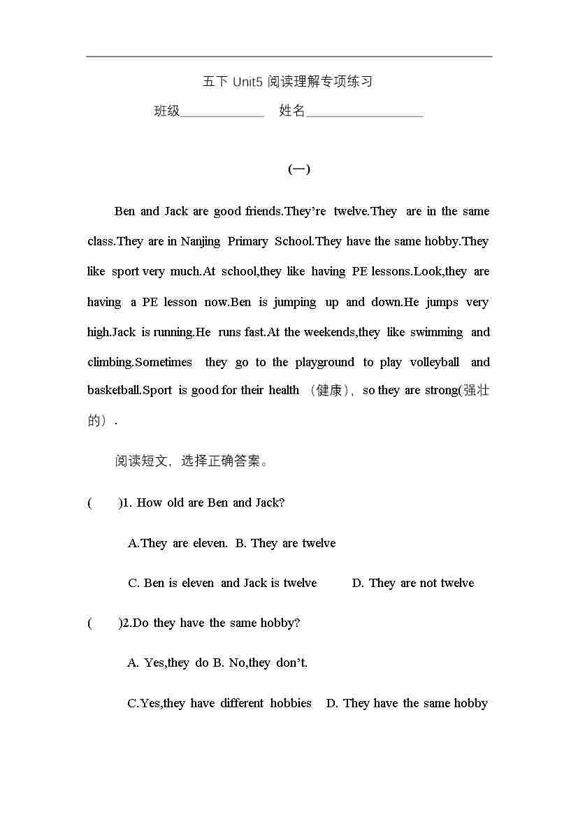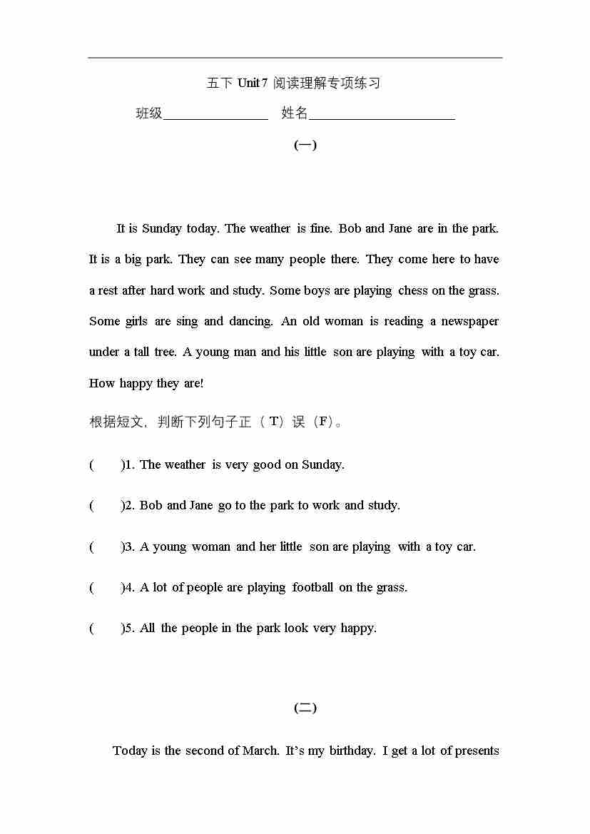 【阅读特训】五年级下册英语 阅读理解专项练习 Unit5 Helping your parents(含答案 译林三起)